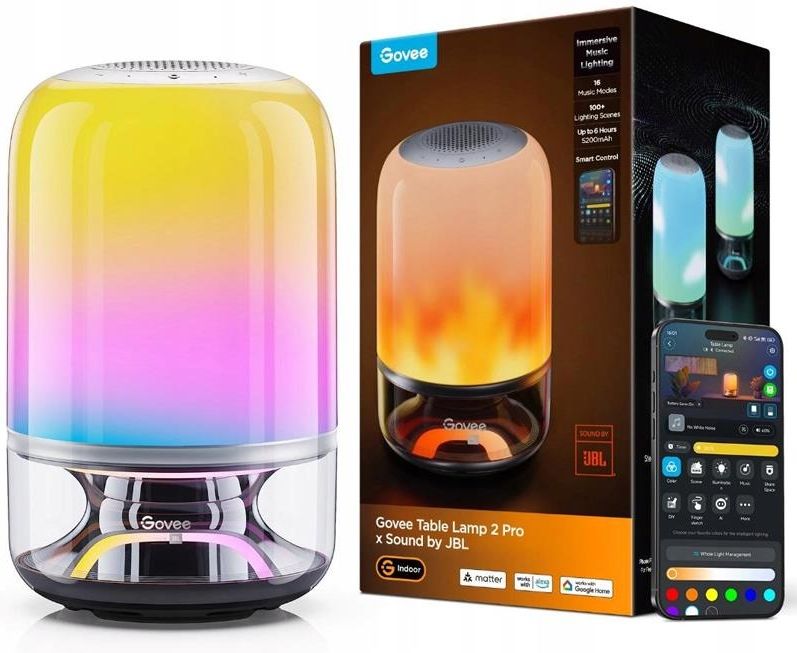 Lampa LED Govee Table Lamp 2 Pro Sound by JBL H60200F1 Kod produktu: H60200F1 Lampa stołowa Temperatura barwowa:2700 K - 6500 K Barwa światła: RGBICWW Łączność Wi-Fi i Bluetooth Sterowanie głosowe i za pomocą aplikacji mobilnej Możliwość przyciemniania: 1-100% 16 trybów reakcji na muzykę Pełna kreatywność Zmień sposób, w jaki doświadczasz muzyki i światła dzięki lampie stołowej Govee 2 Pro X Sound by JBL. Ta przenośna lampa to coś więcej niż tylko oświetlenie – oferuje pełne doznania sensoryczne, łącząc żywe oświetlenie RGBICWW z dźwiękiem premium od JBL. Niezależnie od tego, czy relaksujesz się, grasz, czy organizujesz imprezę, lampa tworzy wciągającą atmosferę, która reaguje na każdy rytm muzyki i całkowicie ożywia przestrzeń. Dzięki nowoczesnemu wzornictwu i stylowym liniom idealnie pasuje do każdego wnętrza i robi wrażenie. Ostre i dynamiczne efekty wizualne Wyposażona w 210 wysokiej jakości diod LED zapewniających ostre i dynamiczne efekty wizualne, lampa oferuje ponad 100 konfigurowalnych scen, aby stworzyć idealny nastrój. 16 trybów reagujących na muzykę reaguje na dźwięk w zaledwie 32 ms, dzięki czemu światło nadąża za każdym rytmem. Wbudowana bateria 5200 mAh umożliwia do 4,5 godzin bezprzewodowego światła i dźwięku w dowolnym miejscu. Funkcja wybudzania dotykiem, dwa interfejsy typu C i obsługa parowania stereo sprawiają, że jest to urządzenie równie wszechstronne, co stylowe. Dodatkowo, możesz w pełni spersonalizować efekty świetlne dzięki 210 punktom DIY, co daje nieograniczone możliwości kreatywnego projektowania. Ostre i dynamiczne efekty wizualne Inteligentne funkcje są równie imponujące, co sam sprzęt. Steruj wszystkim za pomocą aplikacji Govee Home, głosowo za pośrednictwem Alexy lub Asystenta Google, a także za pośrednictwem standardu Matter, co zapewnia bezproblemową integrację z inteligentnym domem. Dzięki Music DreamView możesz zsynchronizować do 10 urządzeń Govee, aby stworzyć zapierający dech w piersiach pokaz świetlny w całym pomieszczeniu. Dzięki możliwości regulacji jasności i temperatury barwowej dla każdej sceny, lampa staje się idealnym dodatkiem na każdy nastrój i okazję. Specyfikacja techniczna Rodzaj: Lampa stołowa Zasilanie: Sieciowe, Bateryjne Sterowanie: Głosowe (Asystent Google, Amazon Alexa, Siri), Zdalne (Aplikacja Govee Home) Łączność: Wi-Fi, Bluetooth Temperatura barwowa: 2700 K - 6500 K Ilość diod LED: 210 Źródło światła: Dioda LED Siła światła: 600 lumenów Barwa światła: RGBICWW Czas świecenia: 4,5 godziny (na baterii 5200 mAh) Napięcie: 12 V Materiał: Tworzywo sztuczne Wymiary: 340 x 180 x 180 mm Dodatkowe informacje: Możliwość przyciemniania: 1-100%, 16 trybów reakcji na muzykę, Dźwięk stereo, Ponad 100 scen i 210 punktów DIY, Muzyka DreamView, Interfejs: USB-C Dołączone akcesoria: Instrukcja obsługi, Kabel USB-C #HID:10