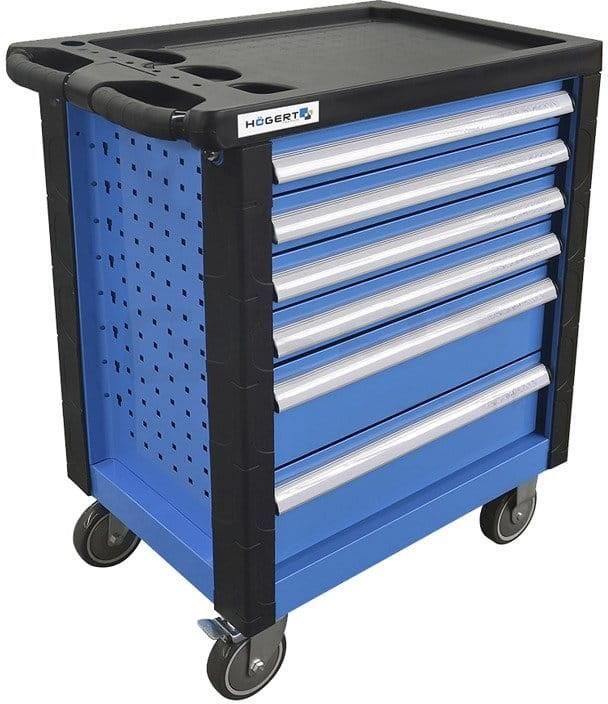 Hogert Szafka Narzędziowa 6 Szuflad HT7G046 Praktyczna szafka narzędziowa z 6 szufladami do przechowywania narzędzi i akcesoriów. 6 wysuwanych szuflad: 4 szuflady wys. 75 mm i 2 szuflady wys. 154 mm. Prowadnice szuflad z mechanizmem wykonane z wysokogatunkowych materiałów. Blokada zabezpieczająca przed samoczynnym wysunięciem szuflady. Kółka z PCV w rozmiarze 5x1.25” z łożyskami kulkowymi. Możliwość zablokowania szafki przed przesuwaniem. Zamknięcie szafki na klucz, w zestawie 2 kluczyki. Wzmocniony blat z tworzywa ABS.
