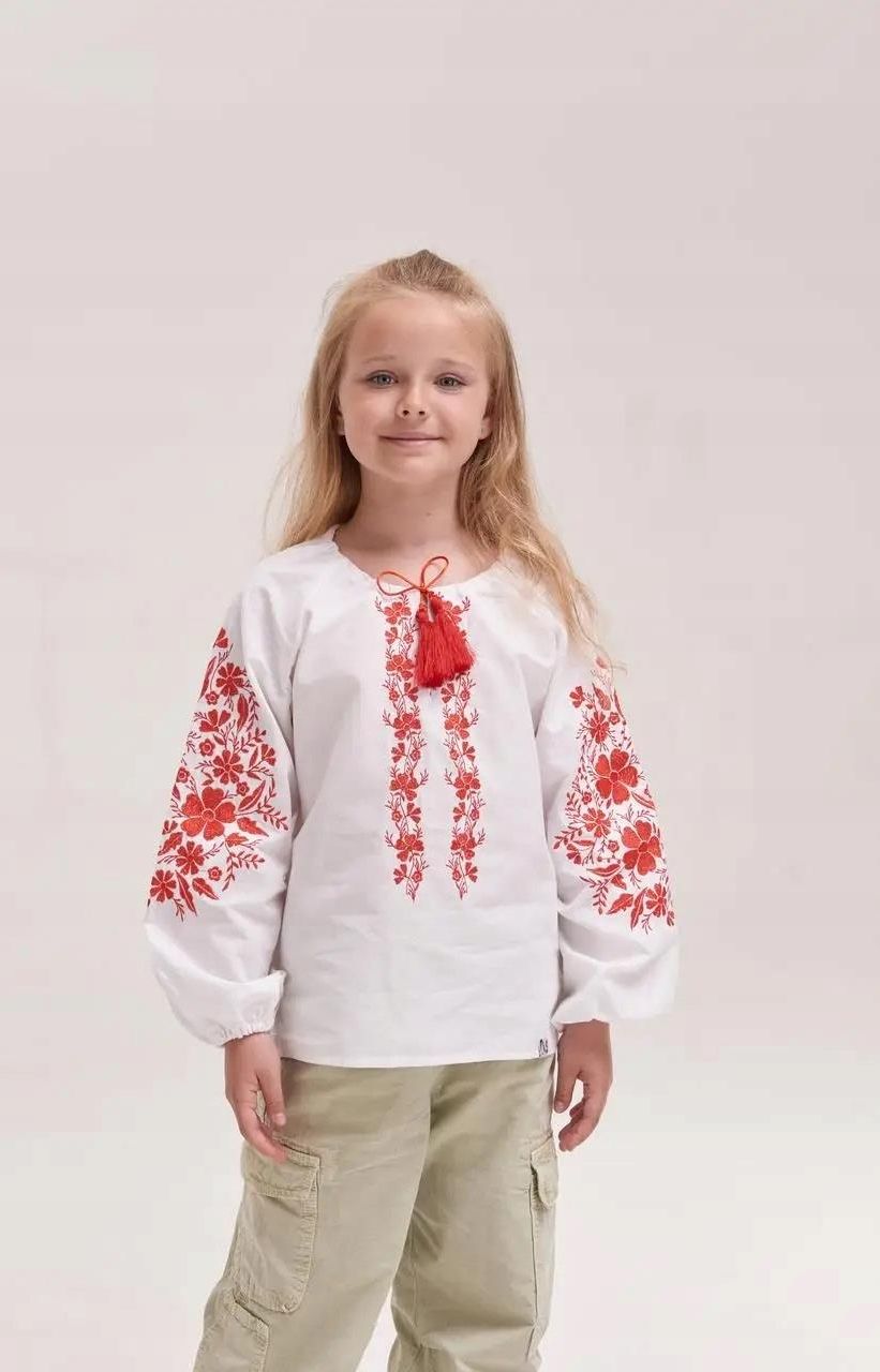 Bluzeczka haftowana dla dziewczynki z jakościowej bawełny, wykonana bardzo starannie i stylowo. Wygodny krój, piękny haftowany wzór. Haft maszynowy wysokogatunkowy - nie "ściąga się" po praniu, nie puszcza koloru, od strony wewnętrznej jest mięciutki. Koszula w stylu folkowym, "wyszywanka" w stylu ludowym Ukrainy. 100% bawełna. Idealna dla małego dziecka, bawełna nie uczula, bluzeczka jest luźna i ma śliczny ornament. Wyszywanka musi być przede wszystkim niedopasowana, zaleca się kupowanie większego rozmiaru. Rozmiar: Szerokość w piersiach, , Długość rękawa , Długość całkowita, см 104: 32, 37.5, 33 110: 33, 40, 35 116: 35, 45, 37.5 122: 36.5, 45.5, 40.5 128: 38.5, 48, 42 134: 40.5, 50, 44.5 140: 42, 51, 46 146: 44, 54, 49 152: 45, 56.5, 51.5 158: 48, 59, 53 Wyprodukowane w Ukrainie. Oryginalne autentyczne ukraińskie wzornictwo. Dzięki zastosowaniu wysokiej jakości materiału oferowane produkty zapewnią wygodę i komfort noszenia. Zapraszamy na inne nasze aukcje Ukraińskiej produkcji.