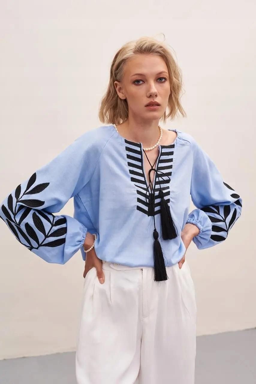 Przepiękna bluza, Ukraińska wyszywanka bardzo wyjątkowej jakości! Mieszanka szlachetnych naturalnych materiałow: 55% bawełna, 45% len. Wykonana bardzo starannie, dopracowany jest każdy szczegół. Bufiaste rękawy i zwiewny materiał sprawiają, że bluzeczka jest lekka i stylowa. Śliczny kwiecisty haft "paproci".Według legend odnalezienie kwiatu paproci stanowiło niezwykle pomyślną wróżbę na przyszłość. Znalazcy zapewniał on bogactwo, mądrość, miłość, szczęście, zdrowie i powodzenie w życiu. Krój jest lużny, wyszywanka przede wszystkim ma być niedopasowana. Na modelce (170 cm wzrost) jest pokazany rozmiar S. Ukraiński producent.