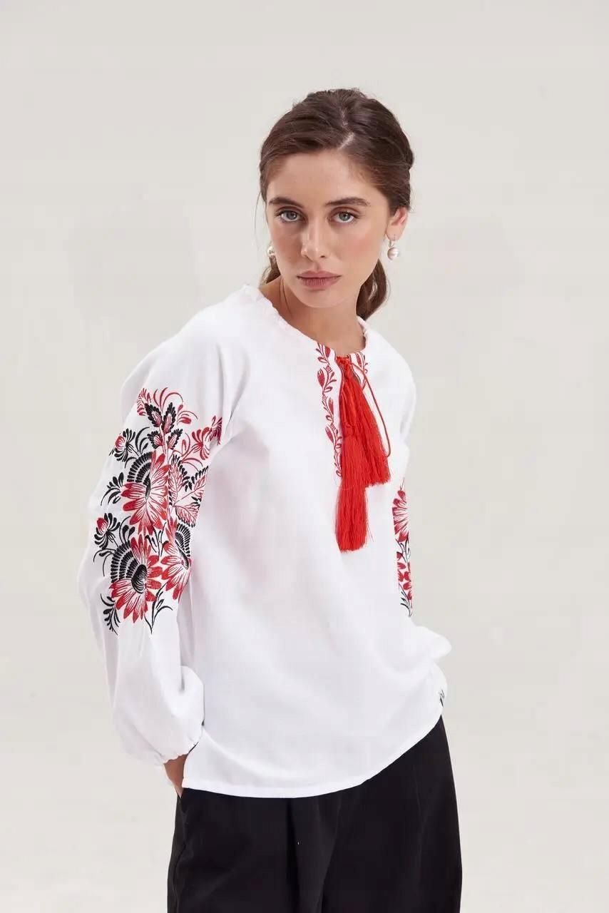 Przepiękna bluzka, wyszywanka cudownej jakości. Mieszanka materiałów: 52% bawełna, 48% poliester. Wykonana bardzo starannie, dopracowany jest każdy szczegół. Bufiaste rękawy i zwiewny materiał sprawiają, że bluzeczka jest lekka i stylowa. Kolory czerwony i czarny w wyszywankach to duchowa mapa Słowiańskiej duszy – czerwony daje życie i miłość, czarny zakotwicza w ziemi i historii. Wyszywane kwiaty w tych kolorach to nie tylko sztuka – to język przodków, zaklęty w nici i symbolach, przekazywany z pokolenia na pokolenie. Krój jest luźny, wyszywanka przede wszystkim ma być niedopasowana. Na modelce (170 cm wzrost) jest pokazany rozmiar S. Ukraiński producent.