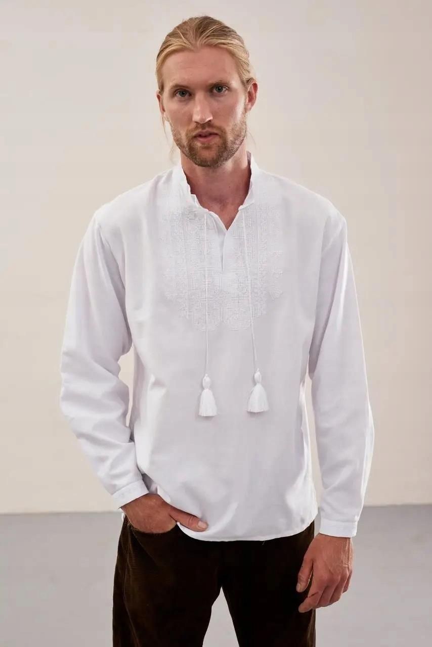 Koszula z jakościowej bawełny, wykonana bardzo starannie i stylowo. Wygodny krój, piękny haftowany wzór. Haft maszynowy wysokogatunkowy - nie "sciąga się" po praniu, nie puszcza koloru, od strony wewnętrznej jest mięciutki. Koszula w stylu folkowym, "wyszywanka" w stylu ludowym Ukrainy. 52% bawełna,48% poliester. Rozmiar UA/EU, Szerokość w piersiach, Szerokość w ramionach, Długośc rękawa, Długość całkowita 48/XS, 54, 47, 62, 73 50/S, 57, 49, 62, 74 52/M, 59, 50, 62, 74 54/L, 61, 51, 62, 74 56/XL, 64, 52, 62, 75 58/2XL, 66, 55, 63, 75 Wyprodukowane w Ukrainie. Oryginalne autentyczne ukraińskie wzornictwo. Dzięki zastosowaniu wysokiej jakości materiału oferowane produkty zapewnią wygodę i komfort noszenia. Zapraszamy na inne nasze aukcje Ukraińskiej produkcji.