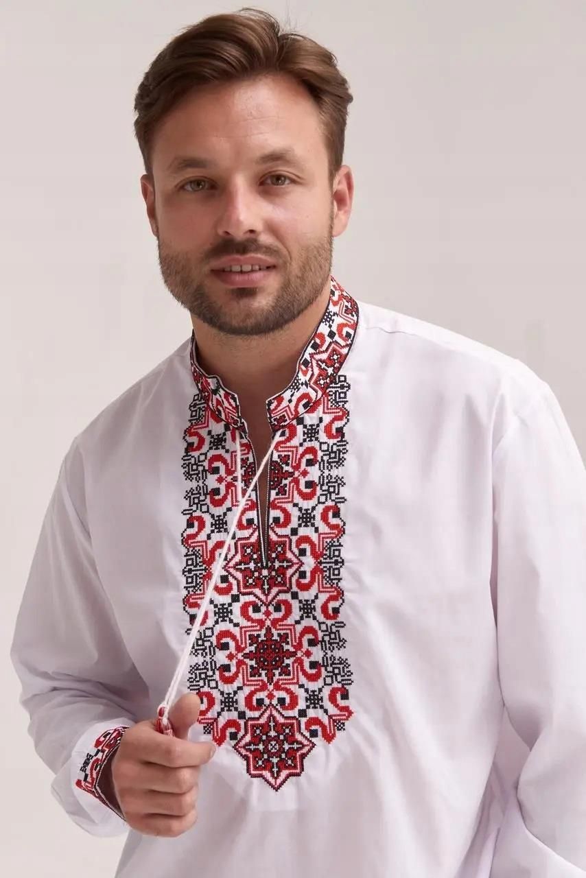 Koszula męska, Ukraińska wyszywanka bardzo dobrej jakości! Wykonana z bawełny z domieszką poliestru - bardzo starannie, dopracowany jest każdy szczegół. Bardzo ładnie się układa, nie potrzebuje prasowania. Jest stylowa i niebanalna. Idealna na wesela Słowiańskie, regionalne imprezy, wesela góralskie, festyny. Ma niepowtarzalny styl i bardzo dobrą jakość. Wyszywanka - jest to koszula bogato zdobiona haftem, która nie jest jedynie zwykłym elementem stroju, lecz kryje za sobą bogatą symbolikę. Koszula jest wyhaftowana wzorem geometrycznym, kwadraty symbolizują stałość, ponadto jego cztery boki mogą oznaczać pory roku, etapy rozwoju człowieka . Proste linie i strzały symbolizują cel, kierunek, sens. Krój jest luźny, wyszywanka przede wszystkim ma być niedopasowana. Ukraiński producent.