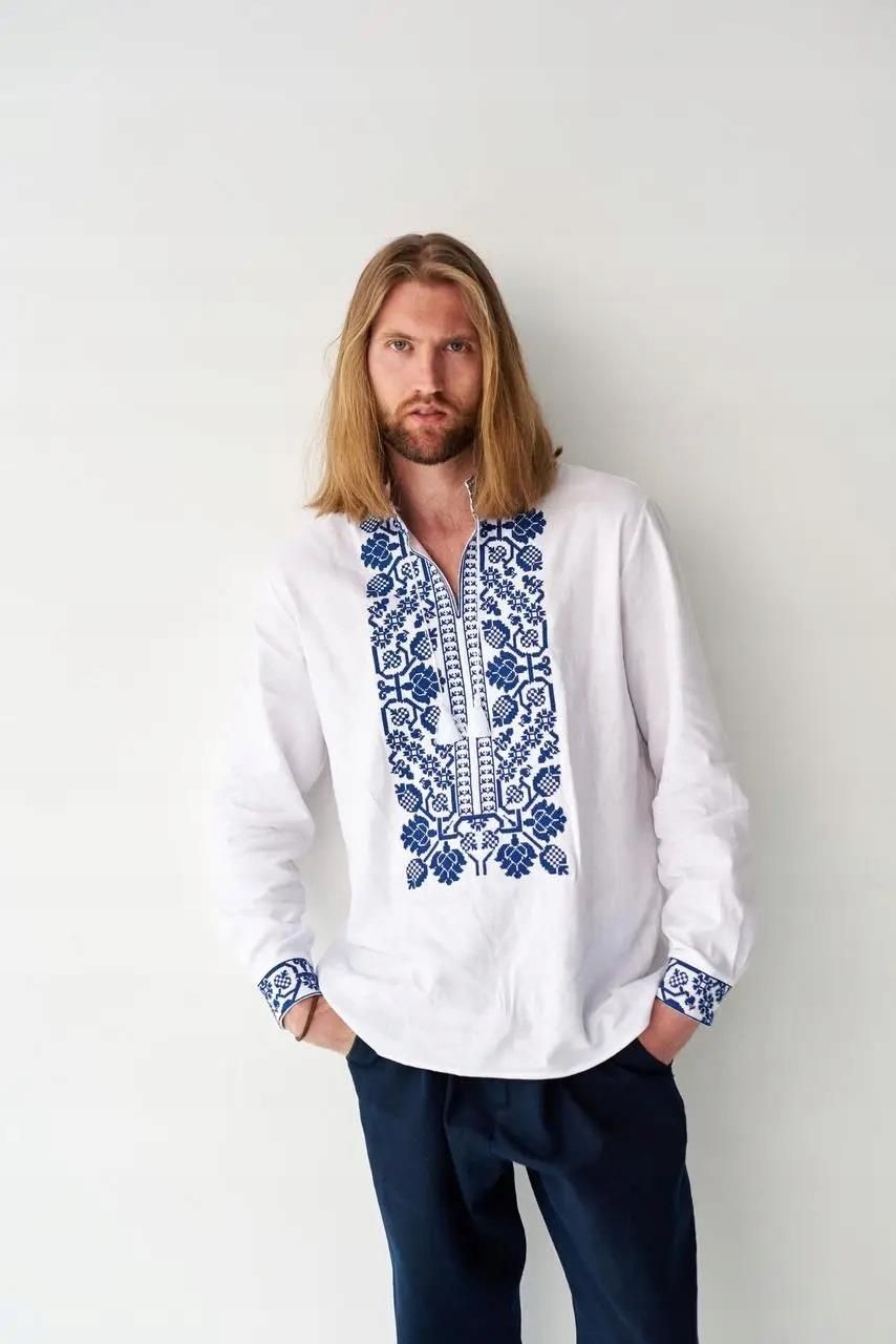 Koszula męska, Ukraińska wyszywanka wyjątkowej jakości w kolorze białym. Wykonana bardzo starannie, dopracowany jest każdy szczegół, przepiękny haft krzyżykowy, niebieski. Wyjątkowa mieszanka naturalnych tkanin: 40% len, 30 % bawełna, 30% wiskoza. Koszula ładnie się układa, jest oddychająca i …