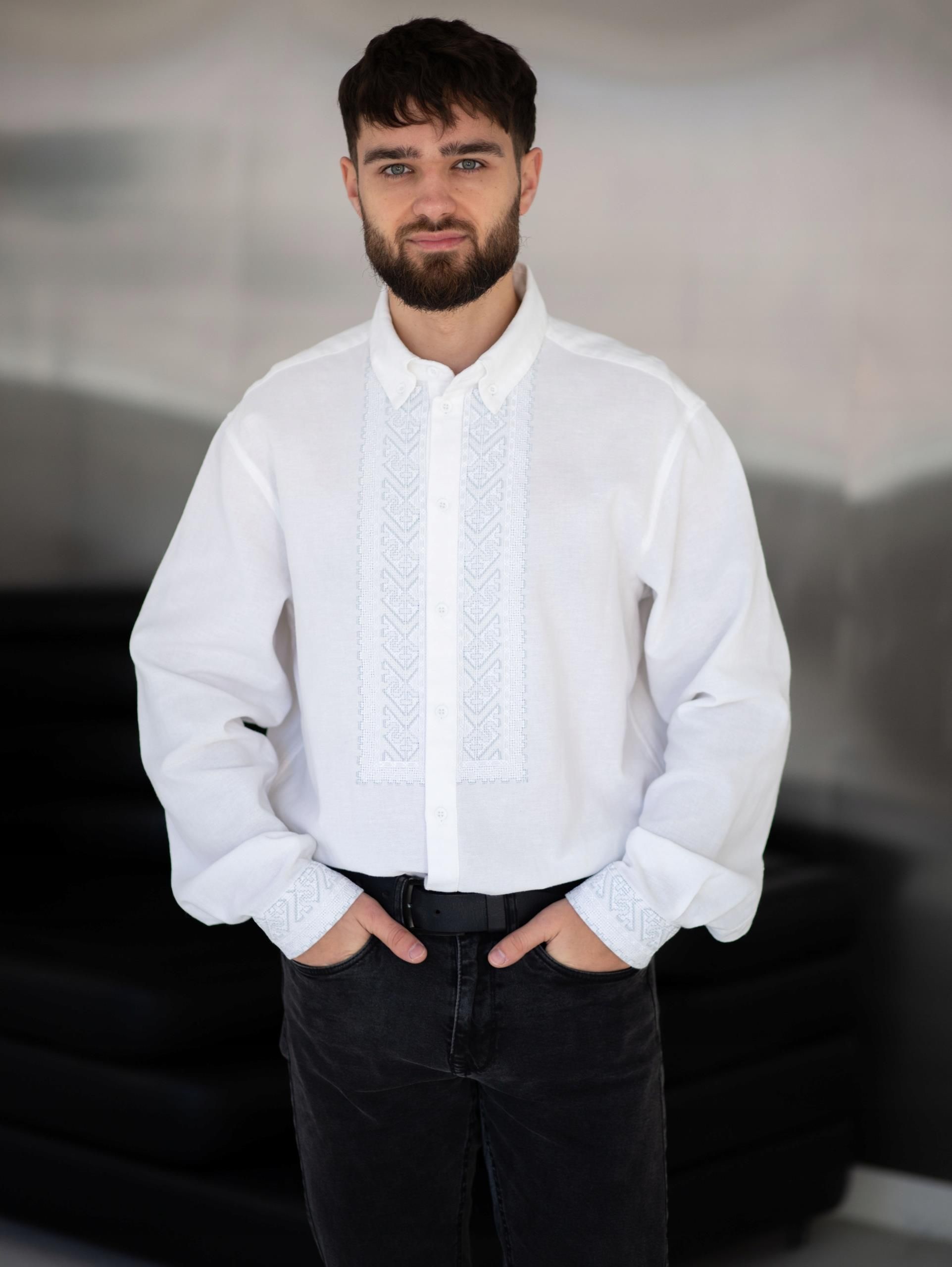 Biała koszula ludowa z białym haftem geometrycznym. Uszyta z naturalnej bawełny z dodatkiem tkaniny konopnej, inspirowana dawnym rzemiosłem naszych przodków. Konopie, od wieków obecne w słowiańskim domu, symbolizowały siłę, trwałość i związek z naturą. Ich włókna służyły do wyrobu odzieży na szczególne okazje — dziś wracają w nowoczesnym, ale głęboko zakorzenionym wydaniu Koszula zdobiona białym haftem — delikatnym, ale pełnym znaczeń — idealnie sprawdzi się jako element stroju na słowiańskie wesele, święta rodzinne lub regionalne, liczne uroczystości. Czystość formy i symbolika tkaniny czynią z niej nie tylko odzież, ale i talizman. Dla tych, którzy czują rytm ziemi i pamięć pokoleń. Ta koszula to prawdziwe dzieło sztuki, w którym tradycja przeplata się z nowoczesnością, a naturalne materiały zapewniają wygodę i lekkość. Wykonana jest z delikatnej, oddychającej tkaniny, która łączy w sobie bawełnę i konopie. Taka tkanina jest nie tylko przyjemna dla ciała, ale ma również specjalną fakturę, która nadaje koszuli szlachetny wygląd. Wywijany kołnierzyk dodaje obrazowi dyskretnej elegancji, dzięki czemu ta haftowana koszula nadaje się zarówno do codziennej garderoby, jak i na specjalne okazje. Długie rękawy z mankietami tworzą wyrazistą sylwetkę, podkreślając jednocześnie powściągliwą męskość i wyrafinowanie. Głównym atutem tej koszuli jest srebrny geometryczny haft na przodzie produktu. Wzór zdaje się grać ze światłem, zmieniając jego odcienie w ruchu. To nie tylko ozdoba, ale symbolika zakodowana w liniach i kształtach: równowaga, nieskończoność, harmonia. Idealna na ślub Słowiański. Zapięcie na guziki, starannie umieszczone na listwie, mankietach i kołnierzyku, nadaje koszuli eleganckie wykończenie. Rozmiar UA/EU, Szerokość w piersiach, Szerokość w ramionach, Długość rękawa, Długośc całkowita 48 (XS), 56, 48, 68, 78 50 (S), 57, 49, 68, 80 52 (M), 61, 51, 68, 81 54 (L), 63, 52, 68, 81 56 (XL), 65, 53, 68, 81 58 (2XL), 66, 54, 68, 81 Zamiary są wykonywane na płasko, możliwa tolerancja +/- 2 cm.