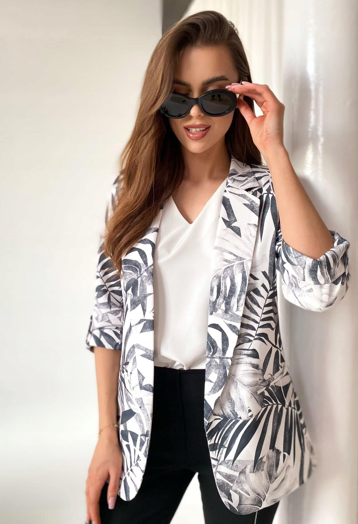 Przepiękna stylowa damska marynarka , Polski Producent ADIKA. Idealna do biurowych stylizacji, ma wąski krój i bardzo ładnie się układa na figurze. Długość marynarki przepięknie wydłuża figurę dodając uroku, jest stylowa i bardzo kobieca, lekko taliowana. Śliczny i bardzo modny wzór paproci w …