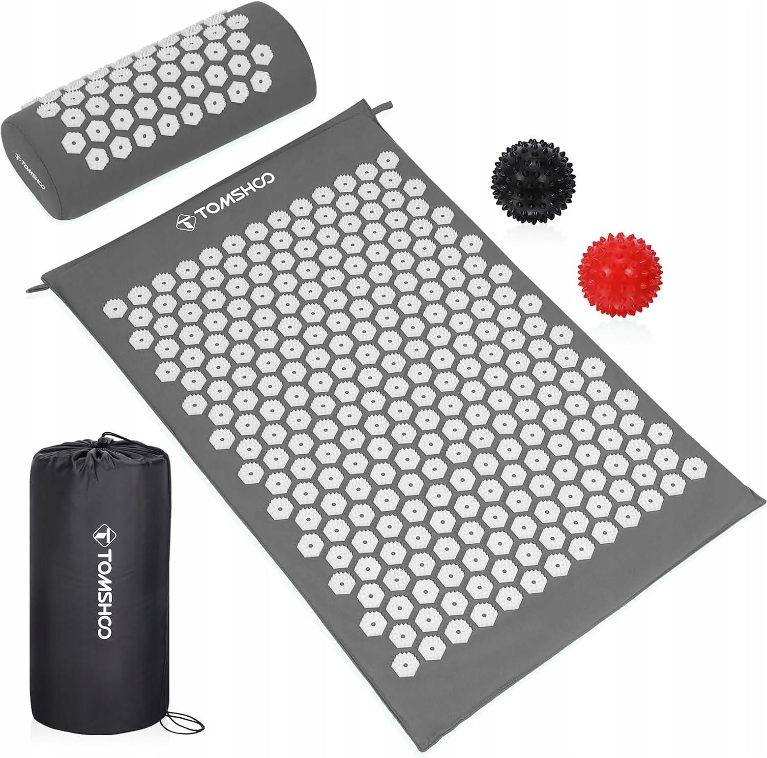 Mata do akupresury w domu Popularna metoda akupresury jest związana z kulturą Chin. To łagodny masaż punktowy polegający na ucisku konkretnych miejsc na całym ciele. Ta metoda jest chętnie stosowana m.in. w rehabilitacji. Parametry: ✔️ Kolor: szara ✔️ Wymiary maty: 68 × 42 × 2 cm ✔️ Wymiary poduszki: 33 × 15 cm ✔️ Materiał: bawełna ✔️Przeznaczenie: dla osób o wzroście do 185 cm Cechy rozet: ✔️ Materiał: ABS ✔️ Ilość rozet na macie: 255 ✔️ Ilość rozet na poduszce: 59 ✔️ Ilość kolców na całej macie: 7800 ✔️ W zestawie do maty dołączona jest praktyczna torba do przechowywania oraz dwie kule masujące. Jak mata do akupresury wpływa na różne aspekty życia? PSYCHIKA ▶️ Redukuje stres i objawy depresji ▶️ Pomaga zwalczyć problemy z bezsennością ▶️ Wycisza i uspokaja np. w przypadku nerwicy lękowej ▶️ Poprawia samopoczucie przy problemach psychologicznych ZDROWIE ▶️ Redukuje ból szyi, barków, kręgosłupa ▶️ Doraźnie działa w przypadku rwy kulszowej ▶️ Łagodzi bóle głowy, neuralgie i migreny ▶️ Poprawia krążenie i rozluźnia mięśnie URODA ▶️ Pomaga w redukcji cellulitu – dba o zdrowy wygląd skóry ▶️ Uelastycznia i ujędrnia skórę, co poprawia przepływ limfy ▶️ Wspomaga redukcję tkanki tłuszczowej ▶️ Poprawia ukrwienie skóry głowy UWAGA! Mata pakowana próżniowo. Po wyjęciu z opakowania należy odczekać 24 godziny do uzyskania właściwego kształtu.