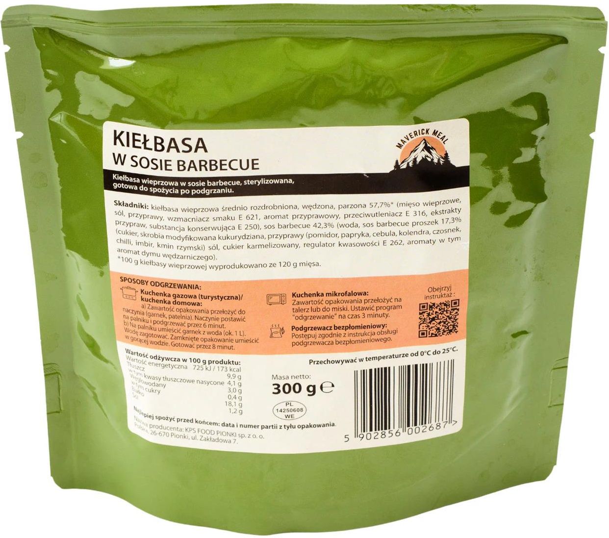 Pełnowartościowy posiłek gotowy do spożycia po podgrzaniu. Wędzona kiełbasa wieprzowa w gęstym sosie barbecue zapakowana próżniowo w wodoodporną torbę wykonaną ze zgrzewanej folii.
