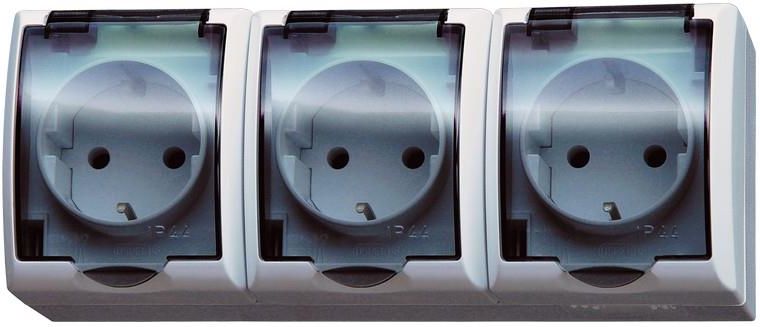 Gniazdo natynkowe potrójne SCHUKO. Gniazdo hermetyczne (bryzgoszczelne). Wieczko: przezroczyste dymne. Napięcie znamionowe: 250V Prąd znamionowy: 16A Stopień ochrony: IP 44