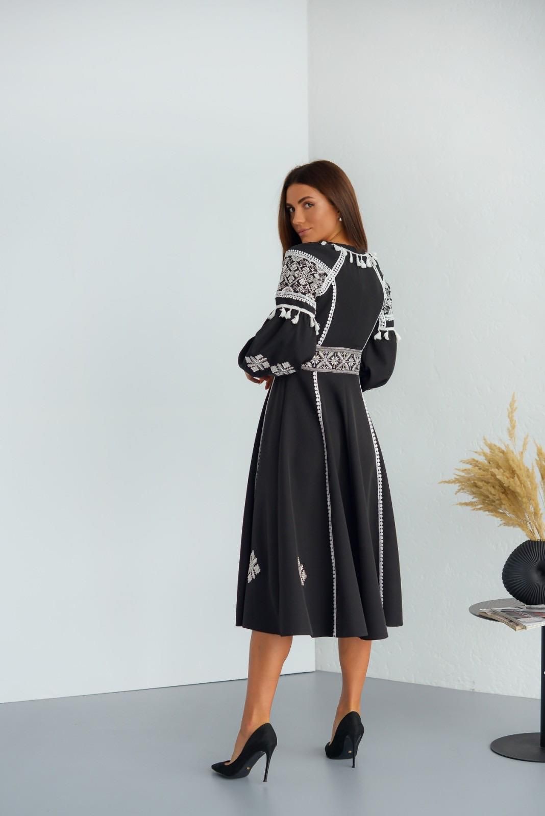 Przepiękna dizajnerska suknia haftowana w czarnym kolorze. Zapinana na śliczne perłowe guziczki, ma bufiaste rękawki i piękny biały haft. Jej długość 7/8 sięga trochę powyżej kostki, podkreślając elegancki i bardzo kobiecy charakter sukienki. Haftowane detale są starannie wykonane, tworząc piękne wzory i dodając sukience unikalnego uroku. Suknia ta jest idealna na specjalne okazje, takie jak przyjęcia, wesela czy kolacje. Wykonana z wysokiej jakości materiałów, gwarantuje komfort noszenia i trwałość. Świetnie sprawdzi się w połączeniu z delikatnymi dodatkami, takimi jak biżuteria, wysokie szpilki. Jakość uszycia jest bardzo dokładna, dopieszczony jest każdy element sukni. Tkanina wysokogatunkowa: 65% bawełna, 35% poliester. Wymiary na rozmiar 40 (Europejski) , wąski krój: Biust: 96 cm Talia: 80 cm Długość całkowita: 113 cm. Suknia unikatowa i niepowtarzalna, produkt niszowy. Jedyny egzemplarz. Zapraszam serdecznie.