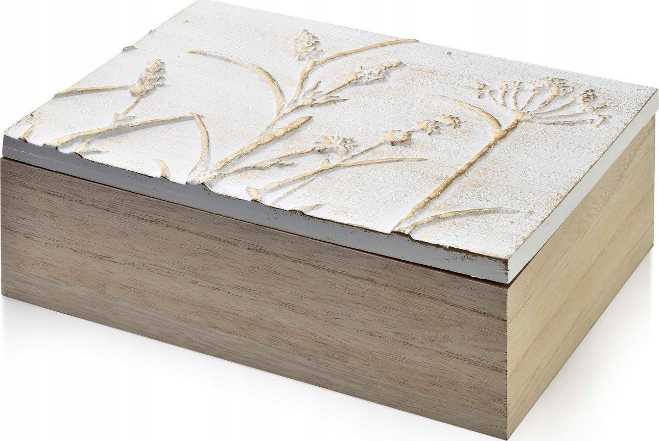Świetnie trafiłeś. Domowe Wystroje to sklep, który wyróżnia się na tle konkurencji. 🤍❤️ Polski sprzedawca i polski sklep 💎 wysoka jakość 📦szybka wysyłka i bezproblemowe zwroty duży wybór towarów Na tej aukcji kupisz SADIE Pudełko 24x17,5xh8cm Pudełko SADIE marki MONDEX since 1986 na herbatę z 6 przegródkami. Wartościowe chwile wymagają odpowiedniej oprawy i nic nie podkreśla ich tak, jak ulubiona herbata serwowana w elegancki sposób. Przedstawiamy pudełko na herbatę z 6 przegródkami. Niezastąpiony element każdej kuchni lub salonu dla miłośników tego aromatycznego napoju.Główne cechy produktu:Przestrzeń: 6 wygodnych przegródek pozwala na schludne przechowanie różnych rodzajów herbaty. Dzięki temu łatwo utrzymasz porządek i szybko znajdziesz ulubiony smak.Design: Klasyczna elegancja drewnianego wykończenia sprawi, że pudełko stanie się nie tylko praktycznym, ale i dekoracyjnym elementem. Pasuje do każdego wnętrza dodając mu charakteru.Funkcjonalność: Przejrzysta pokrywa pozwala na szybki wgląd do środka, co ułatwia wybór odpowiedniej herbaty, bez konieczności otwierania pudełka.Wytrzymałość: Wykonane z solidnych materiałów, gwarantuje stabilność i długowieczność, chroniąc jednocześnie Twoje herbaty przed wilgocią i zanieczyszczeniami.Wszechstronność: Możliwość przechowywania nie tylko herbat, ale również innych drobnych przedmiotów, sprawia, że pudełko jest wielofunkcyjne.wymiary:24x17,5xh8cmwaga: 714g/770gzapakowane jednostkowo w brązowy box: 25x18,5xh9cmprzecierać wilgotną szmatkąprzegródka: 7x7,5cm Niezależnie czy chcesz sprawić przyjemność sobie czy komuś, znajdziesz tu produkty idealne na prezent, który potrafi zaspokoić najbardziej wyrafinowane gusta, sprawiając, że obdarowana osoba poczuje się wyjątkowo ❤️.