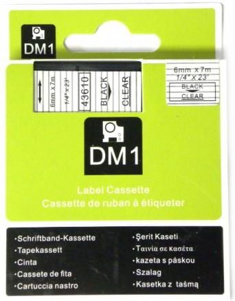 Zamiennik taśmy do drukarek etykiet Dymo 43610 Czarny nadruk na przeźroczystej taśmie Rozmiar 6mm Długość 7m taśmy są w 100% zgodne z drukarkami etykiet Dymo Pasuje do:LabelManager – LM 120P, LM 210D, LM 220P, LM 260P, LM 360D, LM 450D, LM PC IILabelPoint – LP 350LabelWriter – LW 400 Duo, LW 450 …