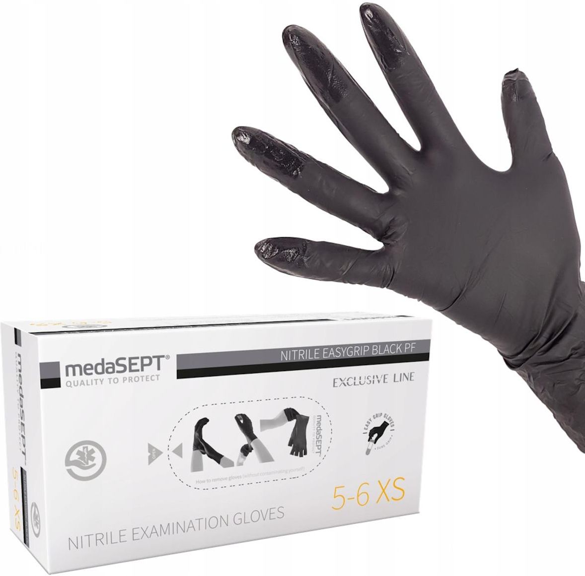 Rękawice nitrylowe medaSEPT Czarne PF -100szt- XL Surowiec: Nitryl Środek pudrujący: Brak Kolor: Czarny Powierzchnia: Tekstura i warstwa adhezyjna na końcach palców Mankiet: Równomiernie rolowany Kształt: Uniwersalny, rękawice pasują na prawą i lewą dłoń Ilość w opakowaniu jednostkowym: 100 sztuk Dostępne rozmiary: S, M, L, XL Wybierz rozmiar: XL Rękawice nitrylowe Rękawice nitrylowe medaSEPT Easygrip to rękawice diagnostyczno-ochronne charakteryzujące się wyjątkową wytrzymałością. Rękawice jednorazowe posiadają warstwę adhezyjną na końcach palców, zapewniającą pewny chwyt i bardzo dobre czucie. Rękawiczki nitrylowe w kolorze czarnym to produkt niejałowy, bezpudrowy, przeznaczony do jednorazowego użycia. Rękawice firmy medaSEPT są wytworzone z nitrylu, dlatego też polecane są dla osób uczulonych na lateks. Rękawice ochronne są miękkie, elastyczne, dopasowują się do kształtu dłoni. Dobra elastyczność pozwala na perfekcyjne wyczucie narzędzi i materiału. Rękawice nitrylowe znajdują zastosowanie w wielu branżach między innymi: pielęgniarstwo, diagnostyka medyczna, stomatologia, weterynaria, farmacja, przemysł spożywczy, gastronomia, kosmetyka czy studia tatuażu. Idealnie sprawdzą się także przy wszelkich pracach domowych. Rękawiczki nitrylowe są uniwersalne, pasują na lewą jak i prawą dłoń. Zalety rękawic nitrylowych Tekstura na powierzchni palców oraz warstwa adhezyjna na końcach palców - zapewnia dużo lepszą chwytność Miękkie, elastyczne, wytrzymałe, dopasowują się do kształtu dłoni Rolowany mankiet - ułatwia zakładanie Nie wykazują właściwości alergizujących – co przekłada się na komfort pracy Doskonała alternatywa dla wszystkich rękawiczek wykonanych z lateksu Kształt uniwersalny pasujący na obie dłonie Galeria