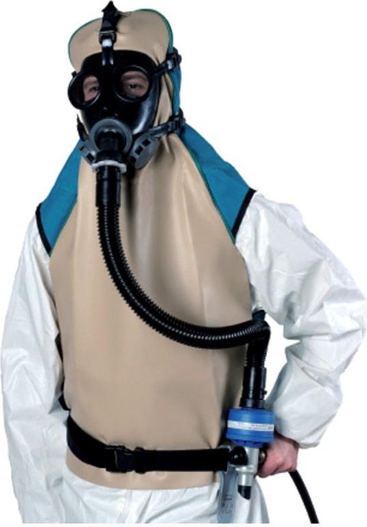 System Spasciani ACS 951 wężowy system izolujący sprężonego powietrza o ciągłym przepływie z maską i kapturem wyposażony z przodu w płaszcz idealny do piaskowania.