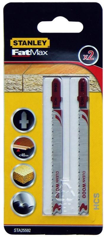 Brzeszczoty FATMAX do wyrzynarki T 2szt. do drewna STA25592 Brzeszczoty Stanley FatMax wykonane ze stali HCS - stali wysoko wglowej Przeznaczone do wspóbienego cicia w drewnie, pycie wiórowej, laminatach i blatach kuchennych o gruboci do 40mm Brzeszczoty do wykoczeniowego cicia w dó Dugo cakowita: 100mm Dugo robocza: 70mm Podziaka: 2,7mm Uchwyt typu T Typ mocowania: Typ T;Rodzaj: Brzeszczoty, Pozostae;Zastosowanie: Do drewna