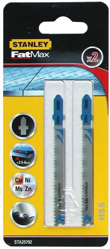 Opis produktu: Brzeszczoty do wyrzynarki 2sztuki uchwyt T do metalu, Stanley FatMax STA25792. Brzeszczoty Stanley FatMax wykonane ze stali HSS - stali szybkotnącej. Mocne brzeszczoty dla dłuższej żywotności. Przeznaczone do cięcia w linii prostej w blachach z metali żelaznych i nieżelaznych o …