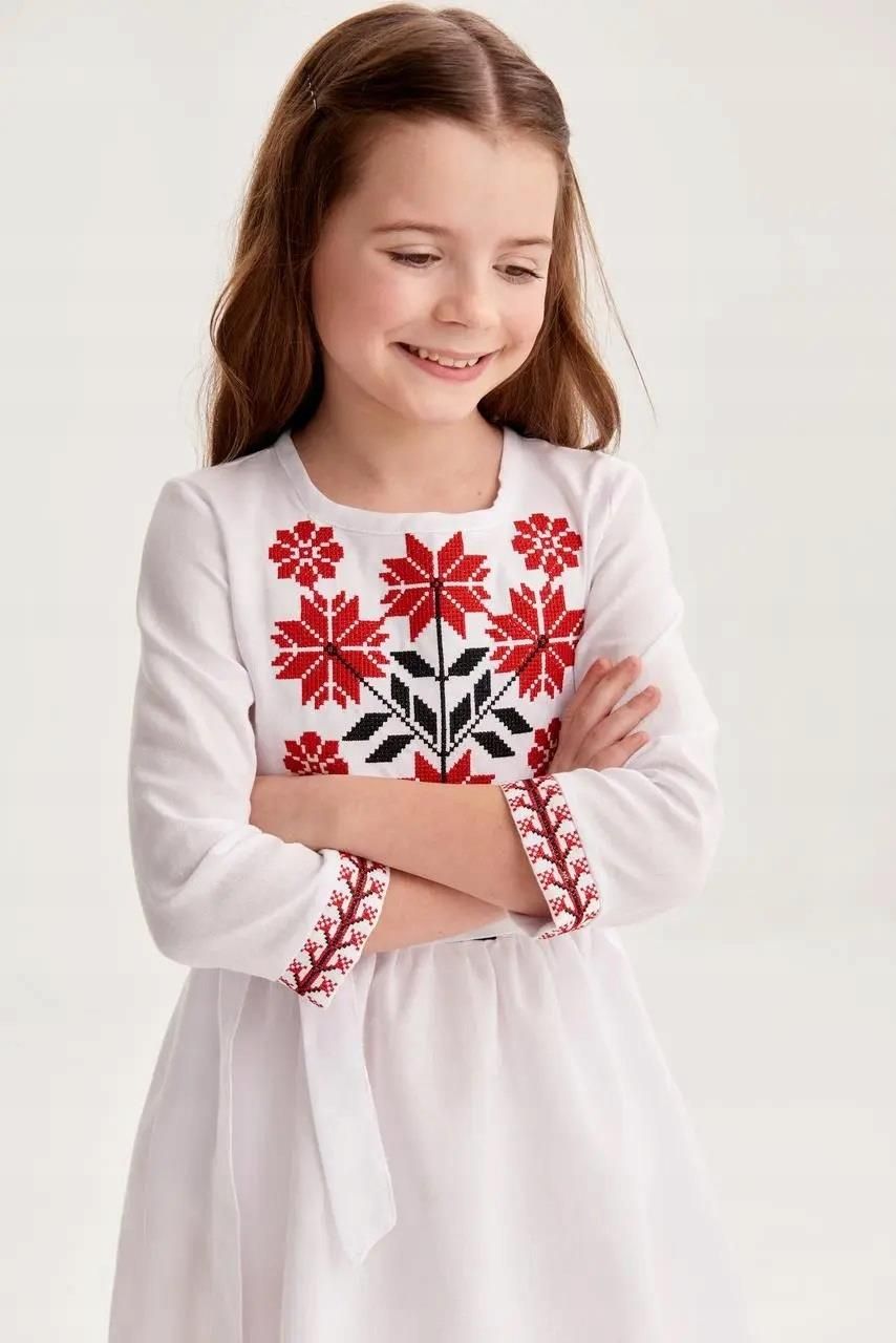 Przepiękna haftowana sukienka dla dziewczynki. Uszyta z bawełny z dodatkiem poliestru, dziecko w niej się nie poci, naturalny materiał nie uczula. Jest lekka i przewiewna. Ma śliczny haft czerwonej ośmoramiennej gwiazdki która jest w kulturze Słowiańskiej symbolem ochronnym. Niepowtarzalna i niebanalnaludowa sukienka. Haft gładki maszynowy, nie ściąga się po praniu, ma mięciutki spód. Autentyczna i bardzo oryginalna. Rozmiar, szerokość w piersiach, talia, szerokość w ramionach, długośc całkowita 110: 28, 26, 22, 56 116: 29, 27, 23, 58 122: 29,5, 28, 24, 60 128: 31, 29, 26, 62 134: 32, 29, 27, 64 140: 33, 30, 28, 67,5 146: 35, 33, 29, 70 152: 37, 36, 30, 74 Ukraiński producent.