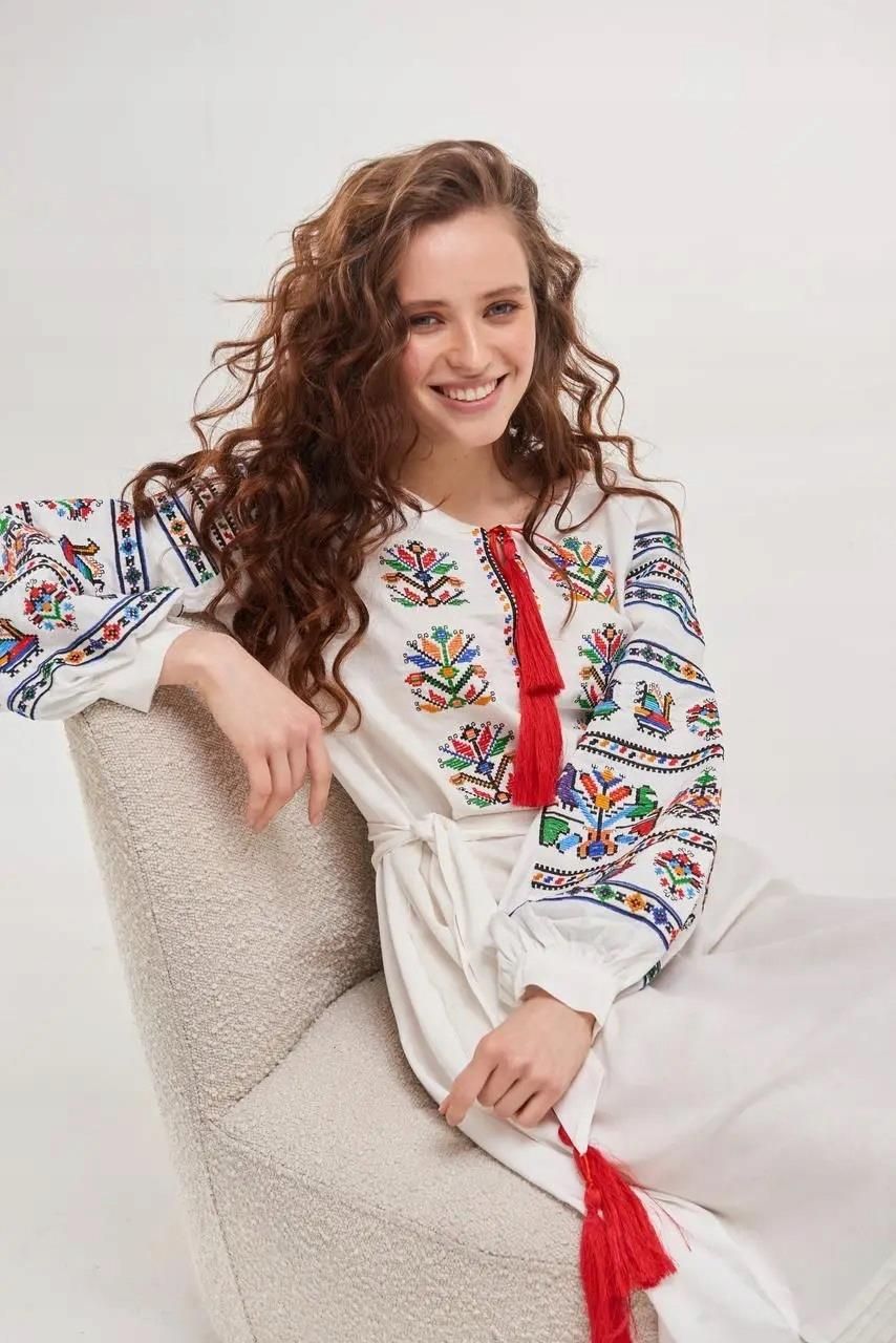 Przepiękna sukienka haftowana wyjątkowej jakości! Mieszanka szlachetnych naturalnych materiałów: 55% bawełna, 45% len. Wykonana bardzo starannie w przepięknym stylu, dopracowany jest każdy szczegół. Bufiaste rękawy i zwiewny materiał sprawiają, że sukienka jest lekka i stylowa. Wyszywanka - jest to koszula bogato zdobiona haftem, która nie jest jedynie zwykłym elementem stroju, lecz kryje za sobą bogatą symbolikę. Krój jest luźny, wyszywanka przede wszystkim ma być niedopasowana. W komplecie jest pasek. Do kompletu rodzinnego jest dostępna męska koszula. Wymiary: Rozmiar,Szerokość w piersiach, Szerokość w biodrach, Rękaw, Długośc całkowita XS-S, 52, 59, 64, 111 M-L, 54, 61, 64, 115 XL-XXL, 56, 64, 65, 116 Na modelce (170 cm wzrost) jest pokazany rozmiar XS/S. Ukraiński producent.