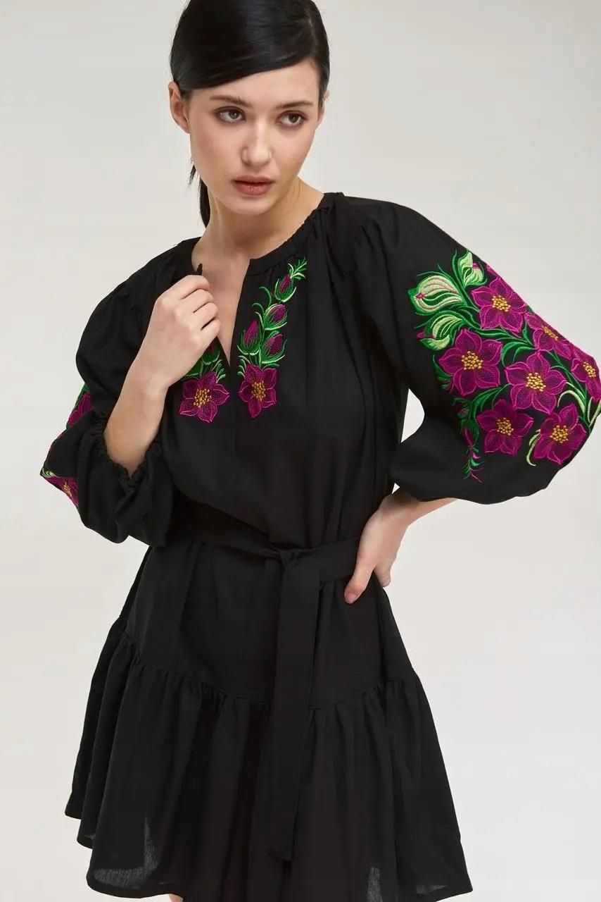 Przepiękna sukienka, Ukraińska wyszywanka bardzo wyjątkowej jakości! Mieszanka szlachetnych naturalnych materiałów: 55% bawełna, 45% len. Wykonana bardzo starannie w przepięknym stylu, dopracowany jest każdy szczegół. Bufiaste rękawy i zwiewny materiał sprawiają, że sukienka jest lekka i stylowa. Wyszywanka - jest to koszula bogato zdobiona haftem, która nie jest jedynie zwykłym elementem stroju, lecz kryje za sobą bogatą symbolikę. Kwitnący sad miał oznaczaćobfitość i powodzenie w życiu. Zaś fioletowy kolor symbolizuje tajemniczość i duchowość. Krój jest luźny, wyszywanka przede wszystkim ma być niedopasowana. W komplecie jest pasek. Na modelce (170 cm wzrost) jest pokazany rozmiar S. Ukraiński producent.