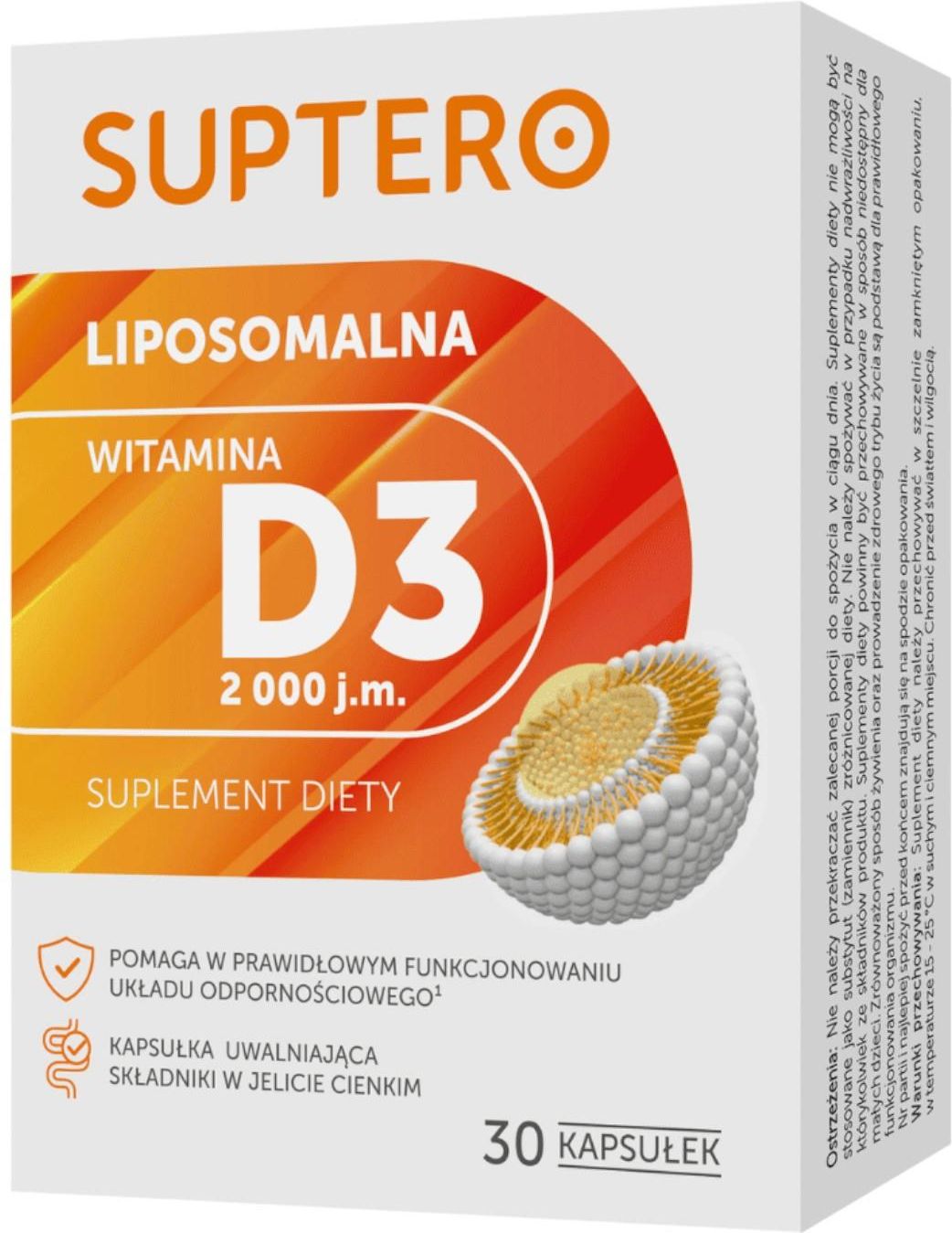 Suptero Liposomalna Witamina D3 2000 j.m. Kapsułki, 30 szt.Suplement diety zawierający liposomalną witaminę D3, która wspiera prawidłowe funkcjonowanie układu odpornościowego oraz pomaga w utrzymaniu zdrowych kości i zębów. Dzięki technologii liposomalnej witamina D3 jest lepiej przyswajalna. Produkt jest odpowiedni dla osób, które chcą zadbać o właściwy poziom witaminy D w organizmie, szczególnie w okresach mniejszego nasłonecznienia.Liposomy - co warto o nich wiedzieć?Technologia liposomalna t