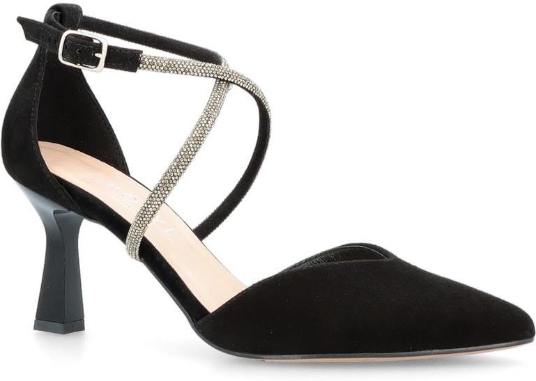 Szpilki z błyszczącymi paseczkami w kolorze czarnym to najnowsza propozycja od firmy Kotyl. Obuwie zostało wykonane z najwyższej jakościnaturalnej skóry zamszowej. Doskonałe wyprofilowanie obuwia sprawia, iż są nie tylko efektowne, ale również bardzo wygodne. 7,5 - centymetrowy obcas kieliszowy jest wygodny i świetnie wyprofilowany. Nosek uformowany w szpic wraz z krzyżowym układem pasków optycznie wysmukla nam sylwetkę. Wkładka wykonana ze skóry naturalnej zapewni nam komfort użytkowania nawet przez całą noc! Błyszczące czółenka Kotyl - idealny dodatek do Twojej wieczorowej stylizacji! Niezwykle wygodne czółenka w eleganckim czarnym odcieniu posiadają wszystkie niezbędne cechy idealnych butów wieczorowych. Zachwycają swym idealnym wykończeniem - nie przejdziesz w nich niezauważona. Doskonale podkreślą kobiecość i wdzięk dzięki zdobnym wykończeniem paseczków, które zdecydowanie nadają im uroku oraz błysku! Dzięki swojej klasycznej i tradycyjnej formie buty będą doskonałym dopełnieniem każdej eleganckiej stylizacji. Zachęcamy do zapoznania się z ofertą butów wieczorowych dostępną na stronie internetowej.