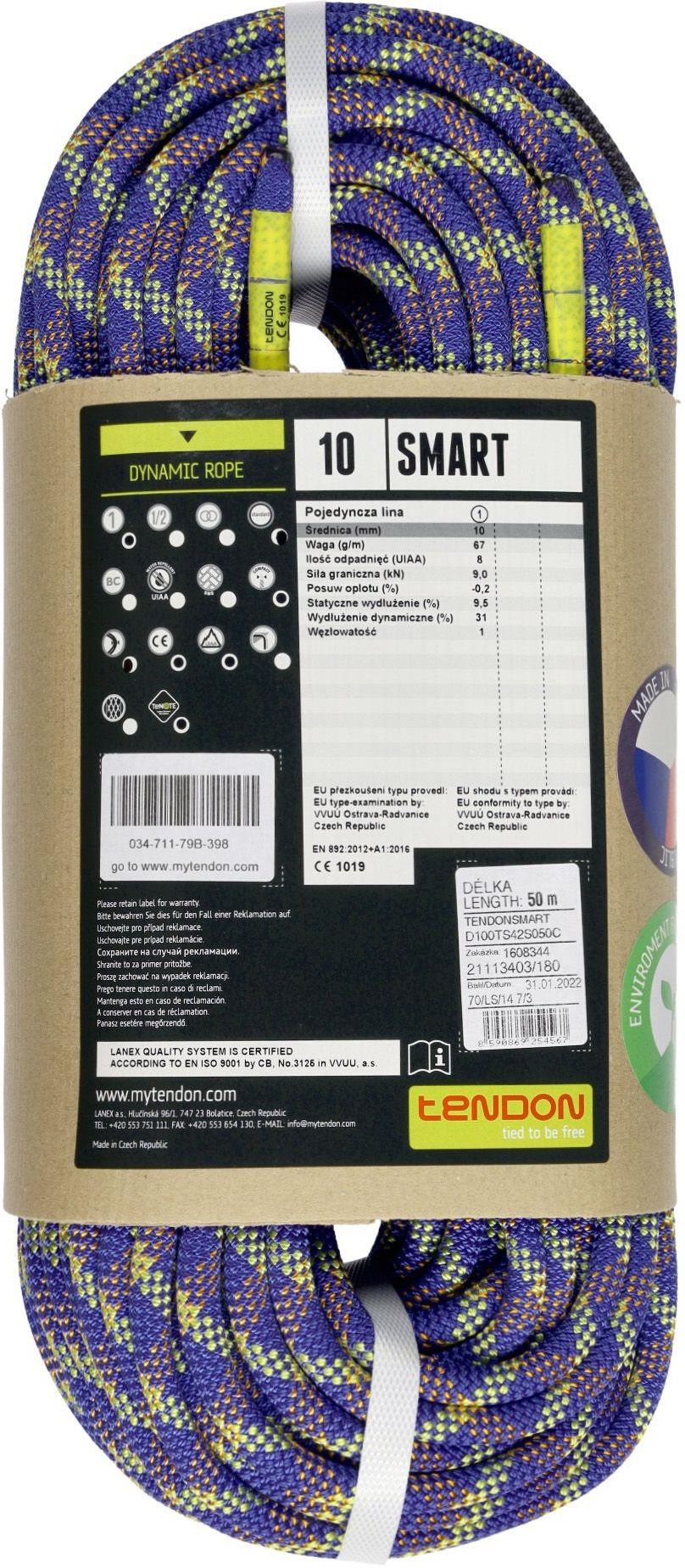 Lina dynamiczna Tendon Smart 10mm 50m to model liny dynamicznej przeznaczonej do wspinaczki skalnej oraz treningów na panelu. Ze względu na swoją średnicę z pewnością zadowoli każdego początkującego wspinacza. Średnica liny wynosząca 10mm będzie bez problemu współpracować z najpopularniejszymi przyrządami asekuracyjnymi. Długość liny sprawdzi się zarówno w skałach jak również podczas wspinania na ściankach wspinaczkowych. Lina dynamiczna Tendon Smart 10,00 mm zaliczana jest do linii BEGINNER, dedykowanej wspinaczom, którzy rozpoczynają swą wspinaczkową przygodę, albo w skały jeżdżą jedynie sporadycznie. Obsługa nie wymaga tu tak dużej biegłości w obsłudze jak w przypadku najcieńszych modeli dla zaawansowanych wspinaczy, przymierzających się do trudnych i długich on sight’ów. Oferuje za to żywotność i doskonały stosunek jakości do ceny. To rozsądny krok w kierunku prawdziwej wprawy. Lina Tendon Smart 10,0 mm 50m - najważniejsze cechy: Pojedyncza lina dynamiczna do wspinaczki w skałach i na ściance; Lina z linii BEGINNER; Optymalna średnica dla początkujących i rzadziej wspinających się osób; Trwale oznaczony środek liny; Impregnowany oplot zewnętrzny (wersja standard); Długość 50m sprawdzi się na większości dróg na polskiej Jurze; Kompaktowo zwężone zakończenia liny.