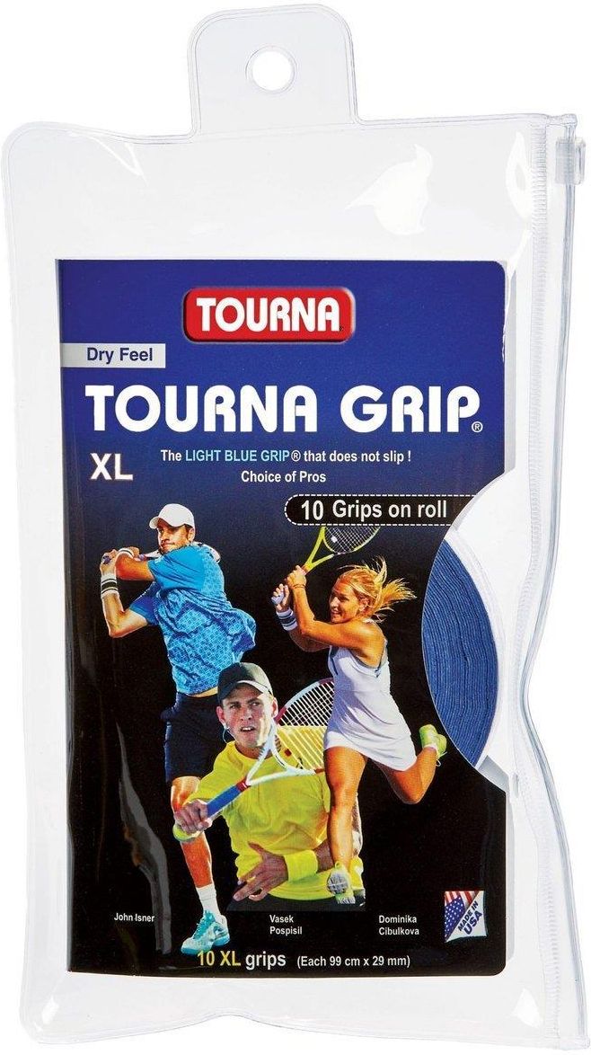 Tourna Grip XL Dry Feel - niezwykle popularne wśród profesjonalistów owijki zewnętrzne. Cienkie i suche, oferują znakomite czucie bez uślizgów. Nieco szersze w porównaniu z wersją Tourna Grip. Dzięki zastosowaniu super chłonnego materiału, który wchłania nawet 350% swojej początkowej wagi, owijki skutecznie absorbują wilgoć pozostawiając uczucie komfortu. Opakowanie zawiera 10 owijek na rolce w wygodnym etui z zamknięciem strunowym. Owijki Tourna to wybór zawodowców od 1977r. Do każdej owijki dołączona tasiemka do zakańczania. Grubość: 0,4 mm, Długość: 99 cm, Szerokość: 29 mm, Kolor: niebieski, Cena za komplet (10 owijki),