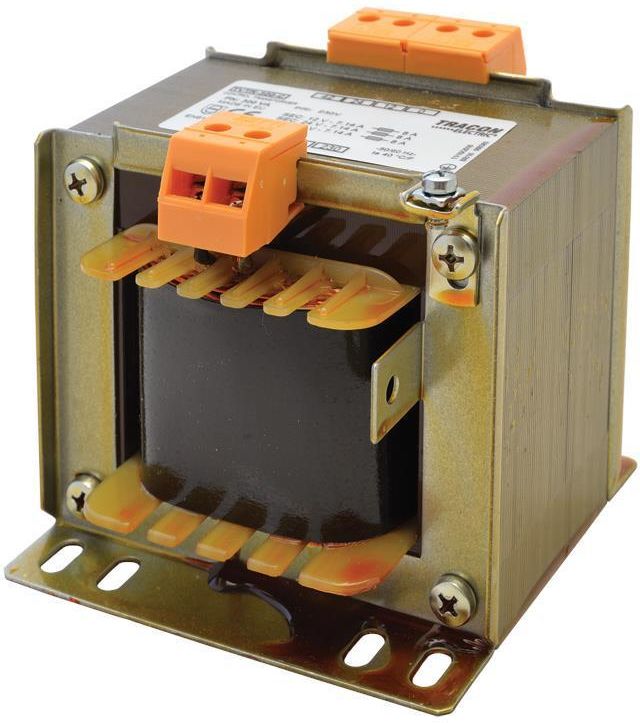 Transformator TVTR-300-C 230V / 12-24-42V Moc: 300 VA Napięcie pierwotne: 230V Napięcie wtórne: 12-24-42 V Moc wtórna : 85,7-171,4-300 VA Prąd wtórny: 7,14 A Temperatura. otoczenia: -5 ...45°C Temperatura izolacji: 120°C Stopień ochrony styków: IP20 Klasa ochronności dotykowej: I Urządzenie TVTR zapewniają izolację obwodu pierwotnego (wejściowego) od obwodu wtórnego (wyjściowego). Można stosować je do dystrybucji mocy w niskonapięciowych elektrycznych systemach sterowania, sygnalizacji, np. do generowania funkcjonalnego niskiego napięcia bezpiecznego (FELV) zgodnie z normą HD 60364-4-41 lub do wytwarzania trybu ochronnego z jednym odbiorcą wtórnym. Transformator spełnia normy PN EN 60742 oraz PN EN 61558. Pod względem ochrony dotykowej jest klasyfikowany jako otwarty (IP00), jest przeznaczony do obudowy za pomocą łączników śrubowych (IP20). Obwód wtórny posiada wyprowadzenia. Moc znamionową zapewnia przy największym napięciu, dlatego przy kolejnych wyprowadzeniach obwodu wtórnego wraz ze zmniejszającym się napięciem oddaje proporcjonalnie mniejszą moc.