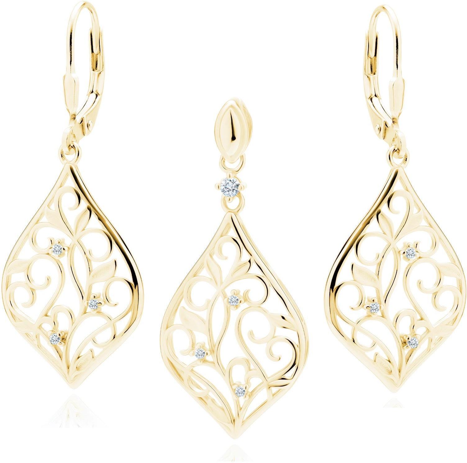 Elegancki wykonany z pozłacanego srebra komplet, składający się z kolczyków na angielskim zapięciu oraz wisiorka, o kształcie przypominającym łezki zdobione ażurowym wzorem oraz białymi cyrkoniami.