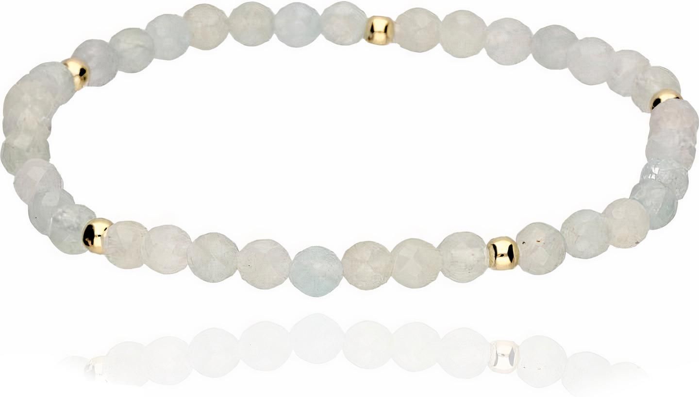 Delikatna bransoletka wykonana z rozciągliwej żyłki jubilerskiej, zdobiona pozłacanymi srebrnymi kuleczkami oraz fasetowanymi kuleczkami z akwamarynu, model YL08-17CM. Bransoletka bez rozciągania ma długość 17cm. Akwamaryn jest nazywany kamieniem odwagi. Przeznaczony jest dla ludzi nieśmiałych, mających problem z asertywnością czy też szczerym wyrażaniem uczuć. Dzięki akwamarynowi, takie osoby wreszcie mogą powiedzieć co myślą i czują, bez wyrzutów sumienia, że mogą tym kogoś zranić.