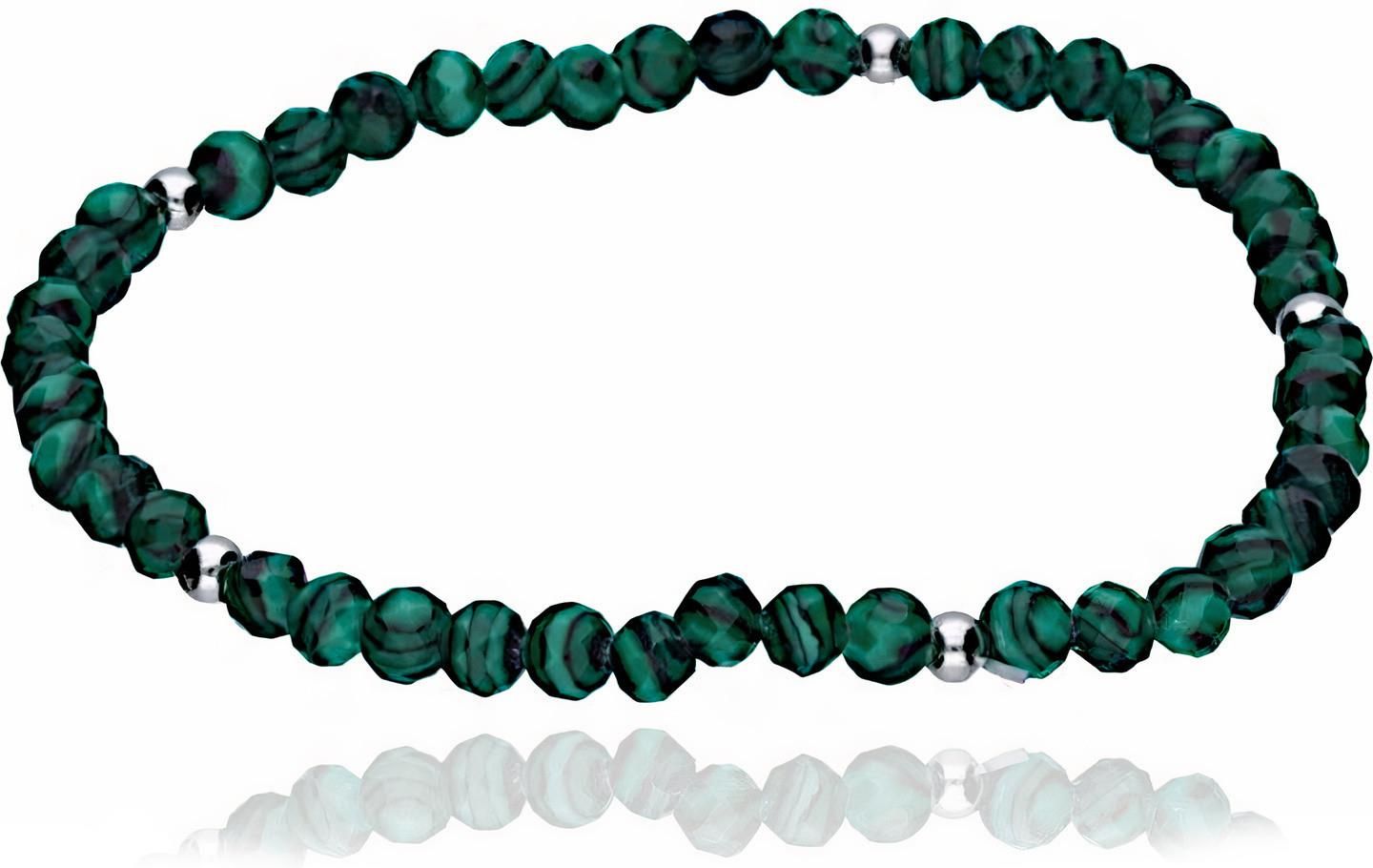 Delikatna bransoletka wykonana z rozciągliwej żyłki jubilerskiej, zdobiona rodowanymi srebrnymi kuleczkami oraz fasetowanymi kuleczkami z malachitu, model YL66-17CM. Bransoletka bez rozciągania ma długość 17cm. Malachit jest nazywany kamieniem równowagi. Ma działanie kojące i przyciągające. Pomaga w wyciszeniu się i odnalezieniu wewnętrznej równowagi. Biżuteria z malachitem, przeznaczona jest w szczególności dla zodiakalnych Koziorożców, Byków i Skorpionów.
