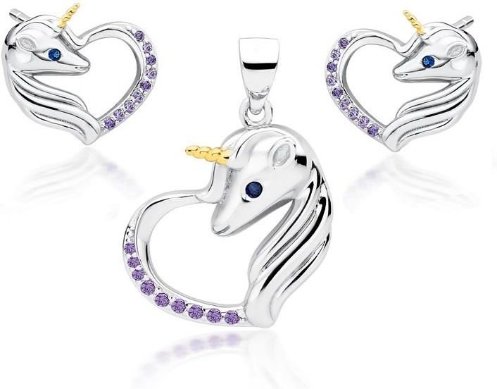Elegancki, wykonany z rodowanego i pozłacanego srebra komplet, składający się z kolczyków na sztyfcie oraz wisiorka, o kształcie serc z umieszczonym w nich jednorożcem, wysadzanymi fioletowymi i szafirowymi cyrkoniami, model Z1728ZGR_VBL.