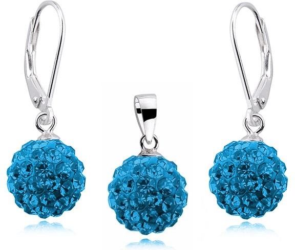 Elegancki wiszący srebrny komplet kulek o średnicy 10mm, wysadzanych kryształkami Swarovski w kolorze capri blue, składający się z kolczyków na angielskim zapięciu oraz wisiorka, model CRH0010DZ10.