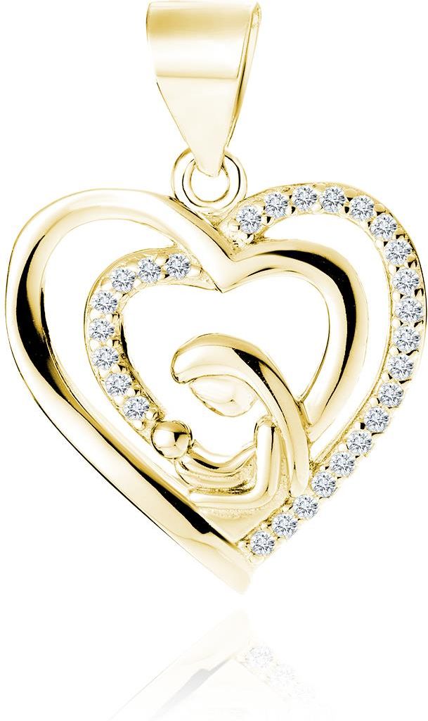 Delikatny wykonany z pozłacanego srebrna wisiorek o kształcie serca, zdobiony matką trzymającą małe dziecko oraz wysadzany białymi cyrkoniami.