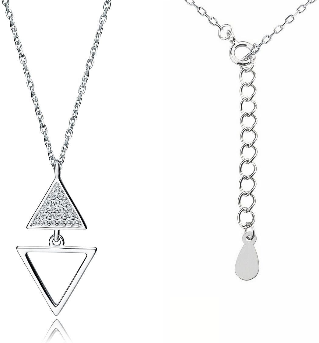 Elegancki, wykonany z rodowanego srebra naszyjnik gwiazd zdobiony dwoma obróconymi względem siebie trójkątami, jednym gładkim polerowanym na wysoki połysk a drugimy wysadzanym białymi cyrkoniami, model Z1850NR_W.