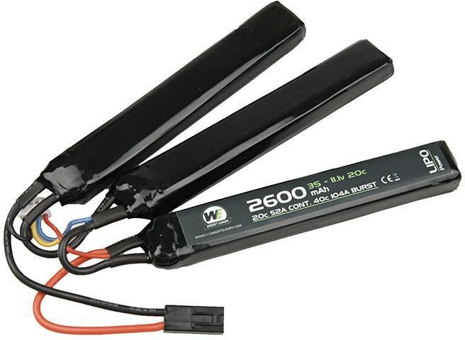 Akumulator LiPo 2600mAh 11.1V - trójdzielny Nowa seria najwyższej jakości akumulatorów typu LiPo produkcji WE Airsoft Europe wychodzi naprzeciw potrzebom każdego airsoftowca. Znajdziemy w niej całą gamę akumulatorów różnych typów i rozmiarów, nadających się do wszelkich rodzajów replik airsoftowych o napędzie elektrycznym. Akumulatory WE Airsoft Europe są bardzo wydajne oraz charakteryzują się długą żywotnością. Pakiety litowo-jonowo-polimerowe ( LiPo ) to następcy znanych pakietów litowo-jonowych ( LiIon ). Podstawową zaletą akumulatorów LiPo jest niewątpliwie stosunek pojemności do wielkości. Są bardzo małych gabarytów przy jednoczesnym zachowaniu bardzo dużej wydajności prądowej, co pozwala dobrać odpowiedni pakiet praktycznie do każdej repliki AEG. Nie posiadają efektu pamięci. Mogą być ładowane bardzo często, bez wcześniejszego rozładowania. Częste ładowanie jest korzystne dla tego rodzaju akumulatora. Należy pamiętać aby pakietu LiPo nie rozładować poniżej 3V na ogniwo oraz nie przeładować powyżej 4,2V na ogniwo. Kolejną zaletą pakietów LiPo jest mały procentowy stopień samorozładowania. Nie używany pakiet w skali miesiąca traci około 3-5% energii. Należy pilnować pakietu, gdyż podczas bardzo długiego przechowywania może dojść do rozładowania poniżej dopuszczalnej wartości minimalnej ( 3V na ogniwo ) i nieodwracalnych reakcji chemicznych, które mogą spowodować pogorszenie właściwości pakietu włącznie z jego trwałym uszkodzeniem, w ekstremalnych przypadkach – zapłonem. Nieużywany pakiet LiPo powinien być naładowany średnio w około 70%. Przy prawidłowej eksploatacji żywotność pakietów LiPo wynosi średnio 500-700 cykli. Istotnym aspektem jest temperatura w jakiej mogą pracować pakiety LiPo. W odróżnieniu od pozostałych akumulatorów, ogniwa LiPo dobrze radzą sobie w niskich temperaturach. Ładowane powinny być natomiast w temperaturze pokojowej. Aby zachować dobrą kondycję akumulatorów LiPo należy je podczas ładowania balansować przy pomocy wtyku serwisowego, który posiada większość pakietów LiPo ( dobra ładowarka LiPo ma wbudowany balancer ).