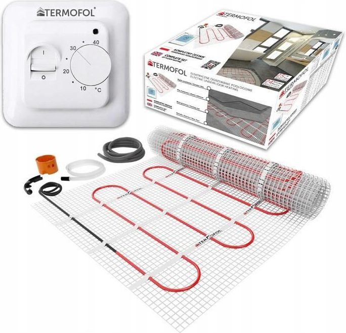 Ekonomiczne i łatwe w montażu rozwiązanie, jakim jest mata podłogowa grzewcza, to nowoczesny sposób na ciepłą podłogę w całym domu. Rosnąca popularność tego typu systemów grzewczych wynika z uniwersalnego charakteru instalacji oraz gwarantowanego, szybkiego rozgrzania podłogi pokrytej gresem, płytkami ceramicznymi, terakotą czy marmurem. Stała moc na poziomie 150W/m2 zapewnia optymalne parametry cieplne, a sam system w żaden sposób nie jest zależny od posiadanej instalacji centralnego ogrzewania, dlatego można w dowolny sposób nim sterować. Sprawdzające się doskonale jako ogrzewanie podłogowe maty grzejne stanowią wygodną alternatywę dla klasycznej „podłogówki” zintegrowanej z instalacją C.O. Można je wykorzystywać zarówno do podstawowego, jak i dodatkowego dogrzewania łazienek, kuchni, salonów, przedpokojów oraz wielu innych pomieszczeń w domach, biurach czy obiektach użytkowych. Mata podłogowa grzewcza składa się z systemu przewodów układanych na specjalnej siatce z włókna szklanego. Jej instalacja nie powoduje podniesienia poziomu posadzki, zapewniając przyjemne uczucie ciepłej podłogi, które dodatkowo podniesie komfort użytkowania każdego wnętrza. Dostępne w naszej ofercie maty grzewcze TERMOFOL sprzedawane są w gotowych zestawach montażowych do samodzielnej instalacji. Montaż systemu jest intuicyjny i można przeprowadzić go w domu we własnym zakresie. Dzięki czytelnej i przejrzystej instrukcji dołączonej do elementów grzejnych możliwe jest wykonanie wszystkich czynności bez angażowania fachowca. Dane techniczne mat grzewczych TERMOFOL: • Moc znamionowa maty: 150W/m2 • Napięcie zasilania: 230V +/– 15% 50/60 Hz • Szerokość: 50 cm • Długość: = powierzchnia m2 x2 • Zasilanie maty: jednostronne • Stopień ochrony: IPX7 • Grubość przewodu grzewczego: 3.6 mm2 • Podłoże nośne: siatka z włókna szklanego – samoprzylepna • Gwarancja 25 lat Termoregulator TF-H3: Charakterystyka termoregulatora: • Sterowanie manualne z pokrętła • Brak możliwości programowania prosta zamiana temperatury • Sposób montażu: podtynkowy – w puszce instalacyjnej • Gwarancja: 24 miesiące • Smukły kształt – grubość tylko 12mm! • Śnieżno biały kolor • Sygnalizacja za pomocy diody • Czujnik zewnętrzny – podłogowy w zestawie! Specyfikacja techniczna: • Pobór prądu: • Zakres temperatury: 5–40 °C • Czujnik temperatury podłogi sensor NTC • Maksymalne obciążenie na wyjściu: 16A • Obudowa ochronna: IP21 – umożliwia montaż w łazience • Wymiary: 86×86 mm • Grubość: 12mm • Zasilanie: 230 AC