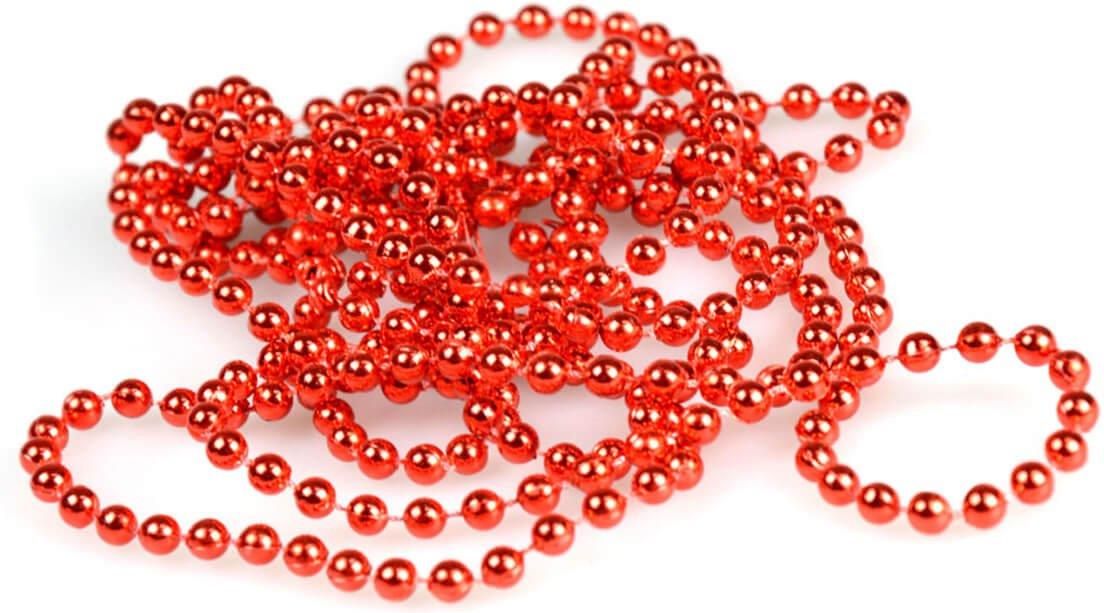 Łańcuch choinkowy z perełkami w kolorze czerwonym. Długość: 270 cm. Średnica pojedynczej perełki: 4 mm. Opakowanie: 1 szt.