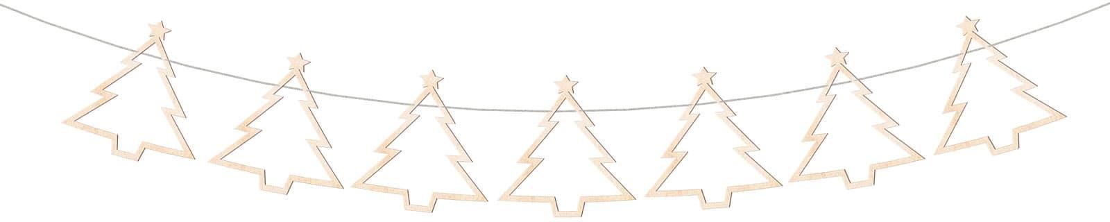 Girlanda drewniana Choinka - 12 szt. Kod produktu: GIR-BNC02-DR Girlanda z zawieszkami w kształcie Choinki wykonana z drewna. Idealne do powieszenia jako dekoracja na Boże Narodzenie. Długość sznurka: ok. 10 m, 12 zawieszek. Wysokość zawieszki ok. 13 cm.