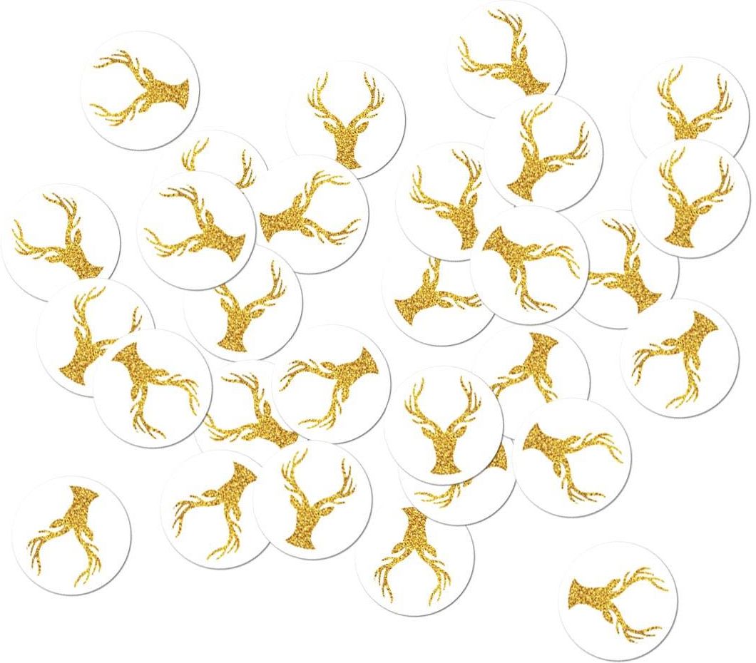 Konfetti papierowe z nadrukiem złotej głowy renifera na białym tle na Boże Narodzenie. Konfetti z dwustronnym nadrukiem. Średnica: 4 cm. Opakowanie: 36 szt.