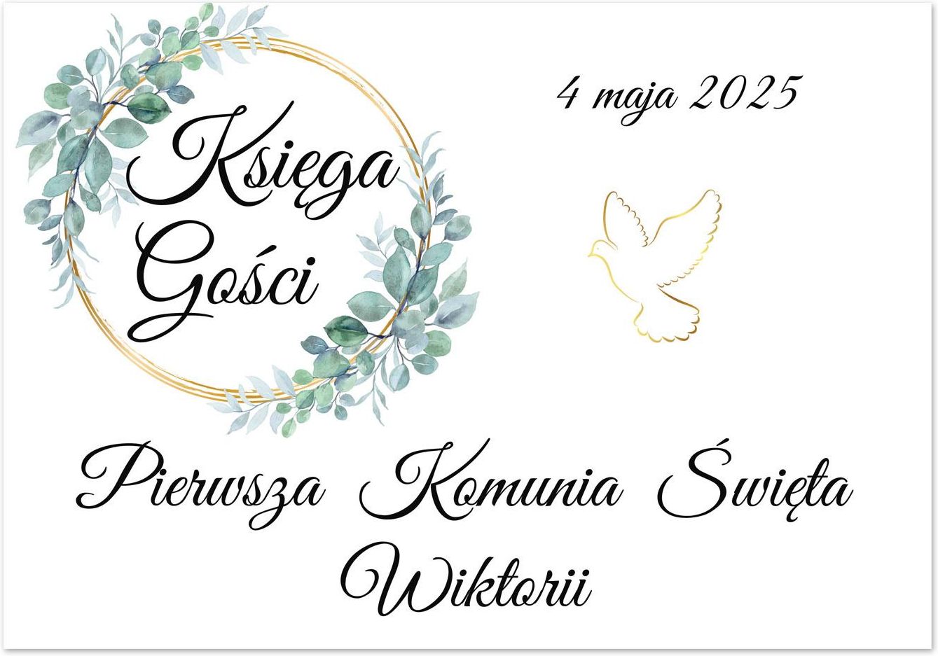 Personalizowana naklejka na okładkę księgi gości do samodzielnego przyklejenia. Wymiary: ok. 29 x 20 cm. W wiadomości do sprzedającego należy podać imię oraz datę I Komunii Świętej. Opakowanie: 1 szt.