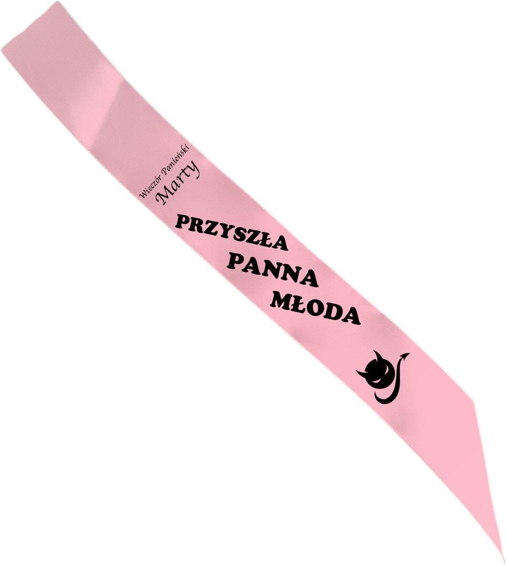 Szarfa atłasowa z indywidualnym imieniem na wieczór panieński. Prosimy podać imię jakie ma być umieszczone na szarfie. Kolor szarfy: jasnoróżowy. Rozmiar: ok 70cm (rozłożona 140) x 10 cm. Opakowanie: 1 szarfa, pasek klejowy.