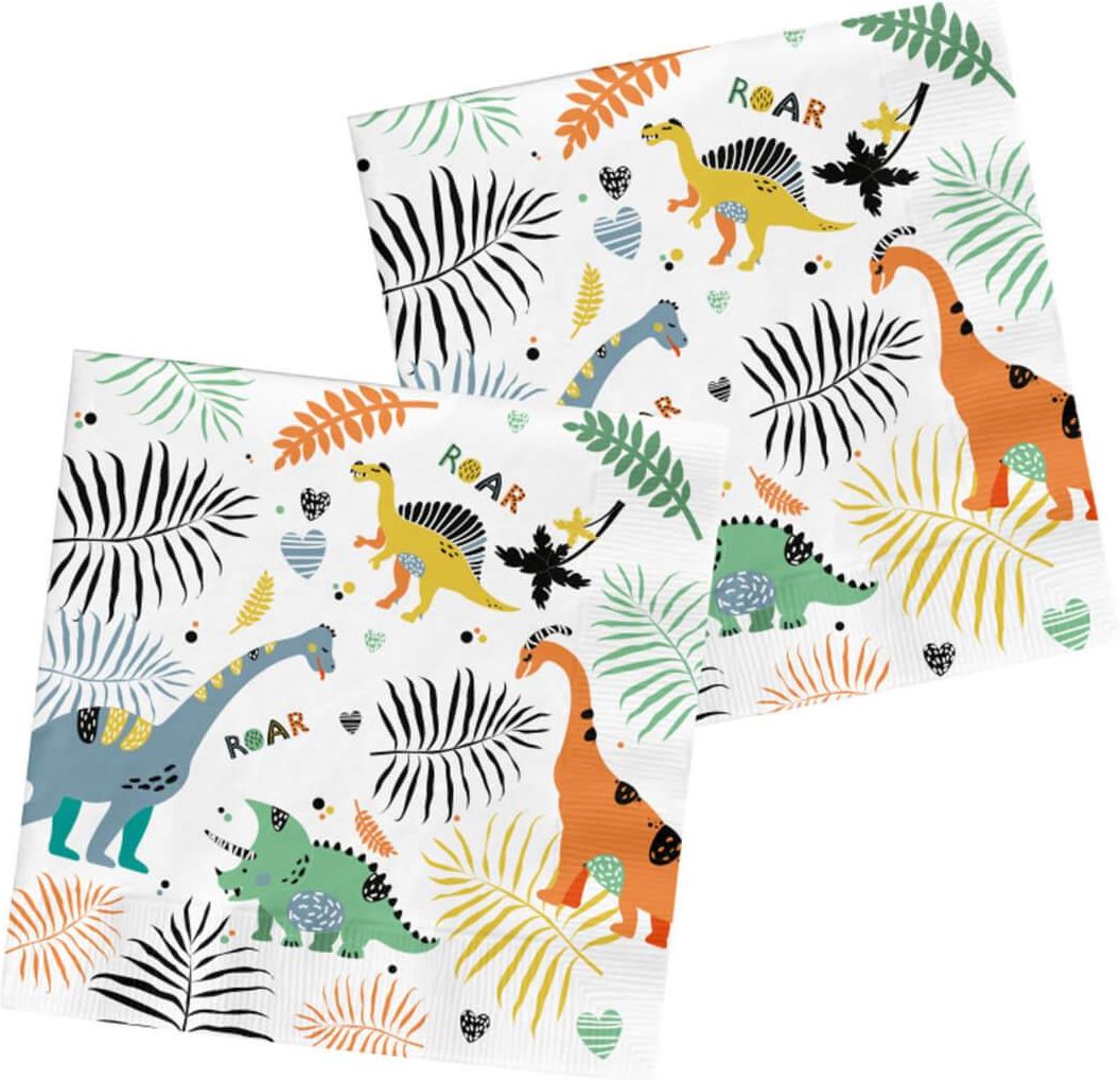 Komplet 20 sztuk papierowych serwetek o wymiarach 33x33 cm, posiadających nadruk dinozaurów pomiędzy roślinami oraz napisy ryczących stworzeń "ROAR". Świetna dekoracja na urodziny oraz wszelkiego rodzaju okazje dla miłośników tejże prawdawnej epoki dinozaurów. Folat,kwadratowy,lunch (33 cm),papier,wielokolorowy