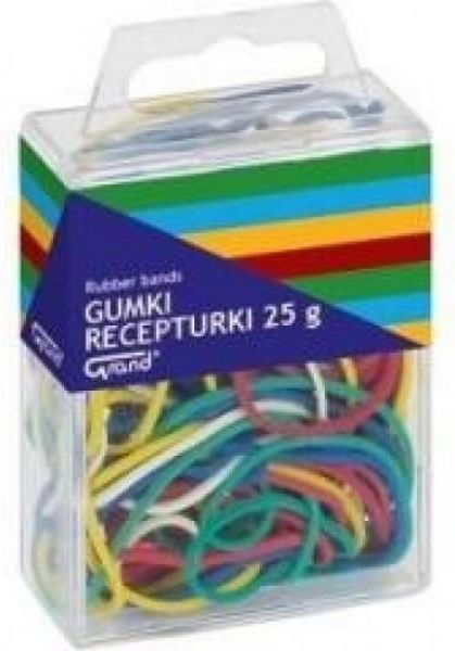 GUMKI RECEPTURKI GRAND 25G 57MM MIX KOLORÓW elastyczne gumki miks kolorów w pudełku średnica: 57 mm zapakowane w plastikowe pudełeczko wymiary opakowania: 93x57x20