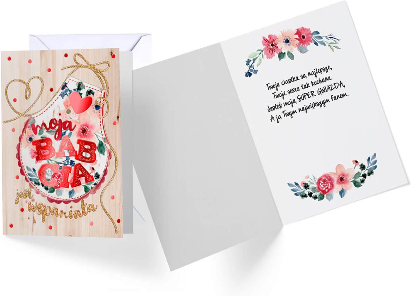 Kartka okolicznościowa z życzeniami z okazji Dnia Babci. Na kartce znajduje się napis: "Moja Babcia jest wspaniała". W zestawie znajduje się koperta. Wymiary: 16,6 x 11,7 cm. Opakowanie: 1 szt.