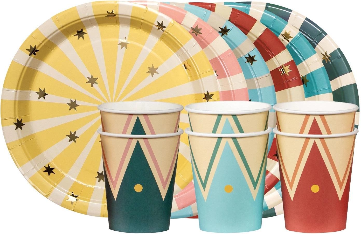 Zestaw papierowy z motywem Cyrku. W komplecie: Kubeczki: - 220 ml - 12 szt. Talerzyki: - 18 cm - 12 szt. Opakowanie: 24 szt.