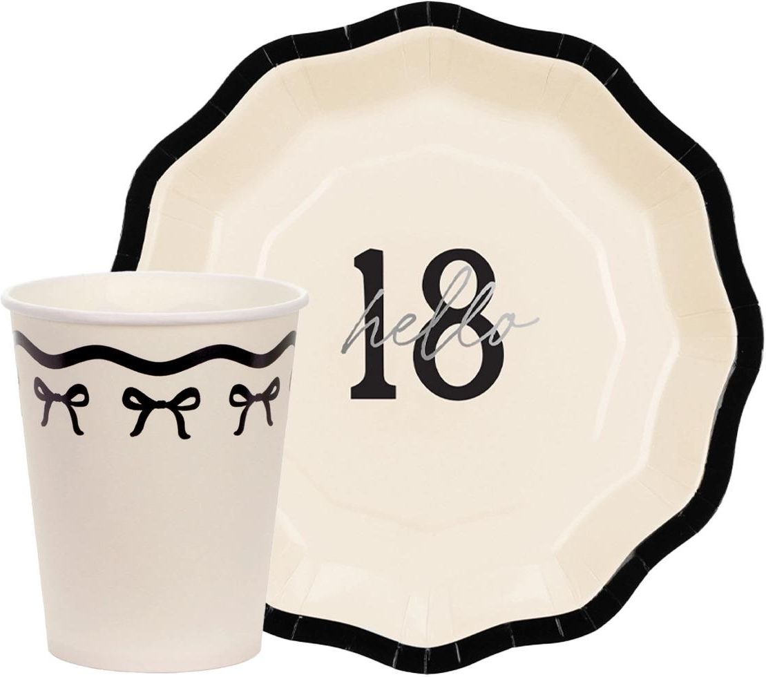 Zestaw papierowy na 18 urodziny. W komplecie: Kubeczki z kokardkami: - 220 ml - 12 szt. Talerzyki: - 18 cm - 12 szt. Opakowanie: 24 szt.