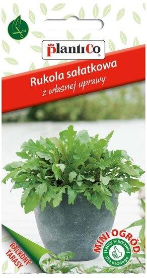 Nasiona rukoli marki PlantiCo. Rukola sałatkowa na cięte listki z serii Mini Ogród do uprawy w pojemnikach na balkony i tarasy to intensywny w smaku składnik sałatek, sosów, dodatek do kanapek i wielu potraw kuchni włoskiej.Wąskie, powcinane liście o korzennym aromacie mogą być zbierane od wczesnej fazy (cięte listki -Baby leaf).Roślina o małych wymaganiach co do podłoża, może rosnąć w półcieniu, do uprawy przez cały rok.