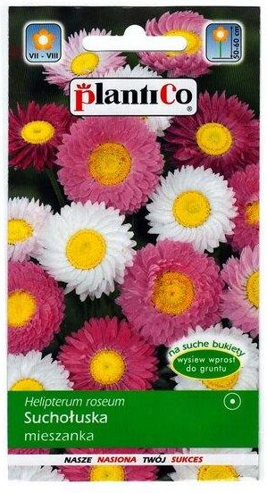 Nasiona kwiatów PlantiCo. Suchołuska, mieszanka kolorów - roślina jednoroczna powszechnie używana na suche bukiety. Kwiaty przeznaczone do suszenia ścina się w pełni rozwinięte, ale przed zawiązaniem nasion. Jest rośliną bardzo łatwą w uprawie, ponieważ można ją wysiewać wprost do gruntu. Wysokość roślin wynosi 50-60 cm. Kwitnie od lipca do sierpnia.