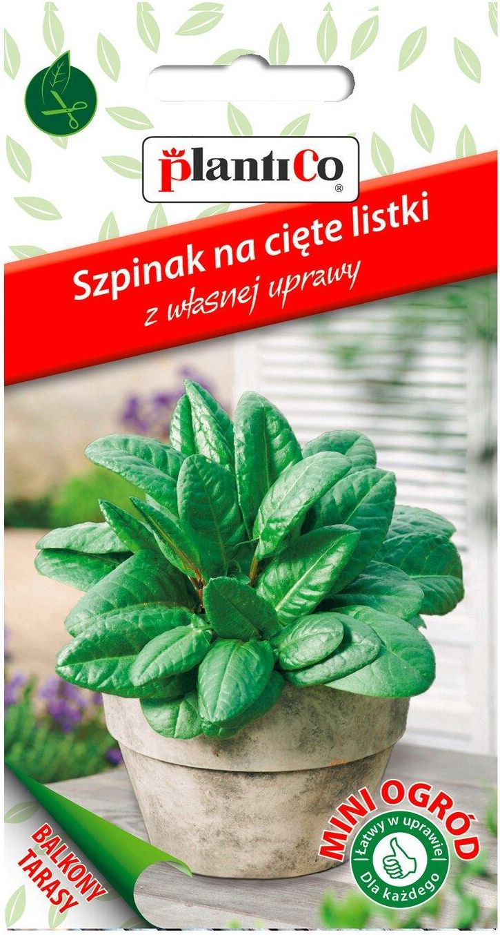 Nasiona szpinaku marki PlantiCo. Szpinak na cięte listki z serii Mini Ogród do uprawy w pojemnikach na balkonach i tarasach. Smaczny składnik sałatek, surówek , dodatek do kanapek i innych potraw. Liście są jednym z najlepszych źródeł wapnia, fosforu i żelaza, witaminy C, witamin z grupy B oraz białka i kwasu foliowego. Mogą być zbierane od fazy młodych liści cięte listki Baby leaf wiosną i późną jesienią.